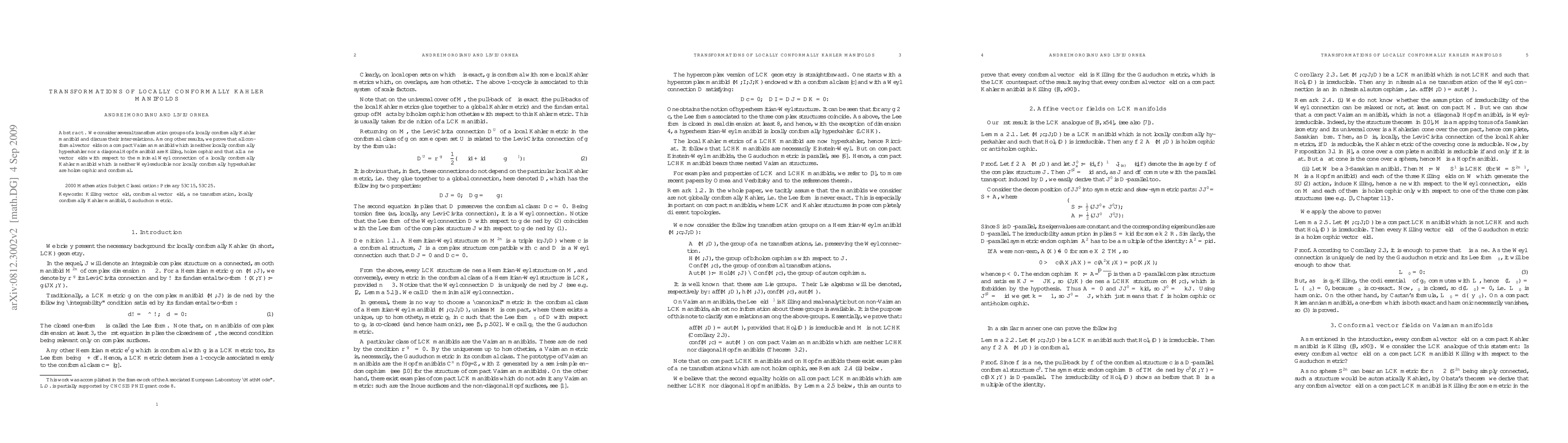 Summary: The paper examines transformation groups of locally conformally Kähler manifolds, proving that certain conformal vector fields on compact Vaisman manifolds are Killing and holomorphic, and that affine vector fields under specific conditions are holomorphic and conformal.