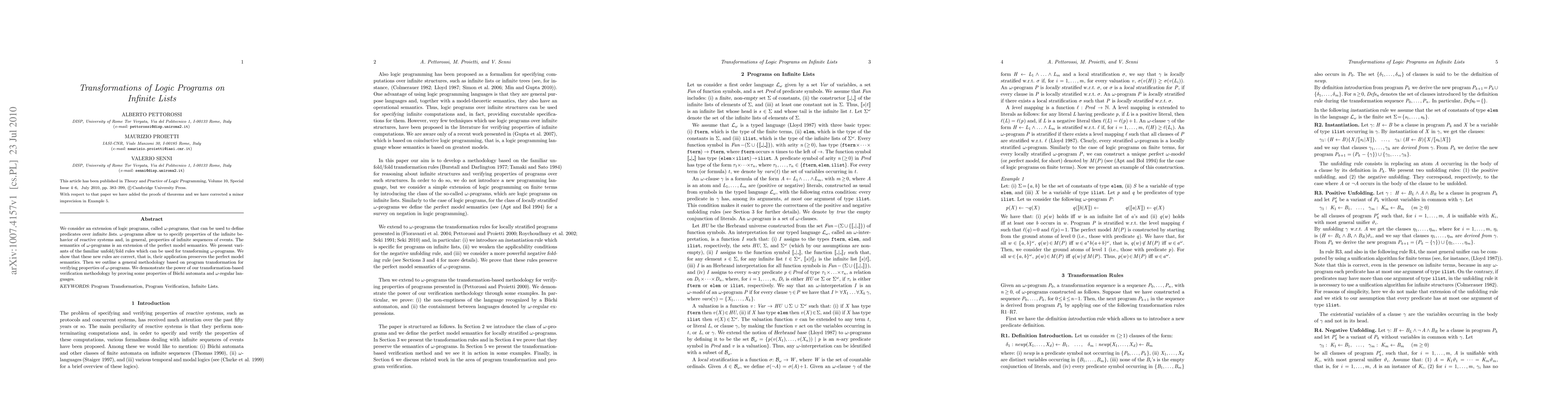 We consider an extension of logic programs, called \omega-programs, that can be used to define predicates over infinite lists. \omega-programs allow us to specify properties of the infinite behavior of reactive systems and, in general, properties of infinite sequences of events. The semantics of \omega-programs is an extension of the perfect model semantics. We present variants of the familiar unfold/fold rules which can be used for transforming \omega-programs. We show that these new rules are correct, that is, their application preserves the perfect model semantics. Then we outline a general methodology based on program transformation for verifying properties of \omega-programs. We demonstrate the power of our transformation-based verification methodology by proving some properties of Buechi automata and \omega-regular languages.