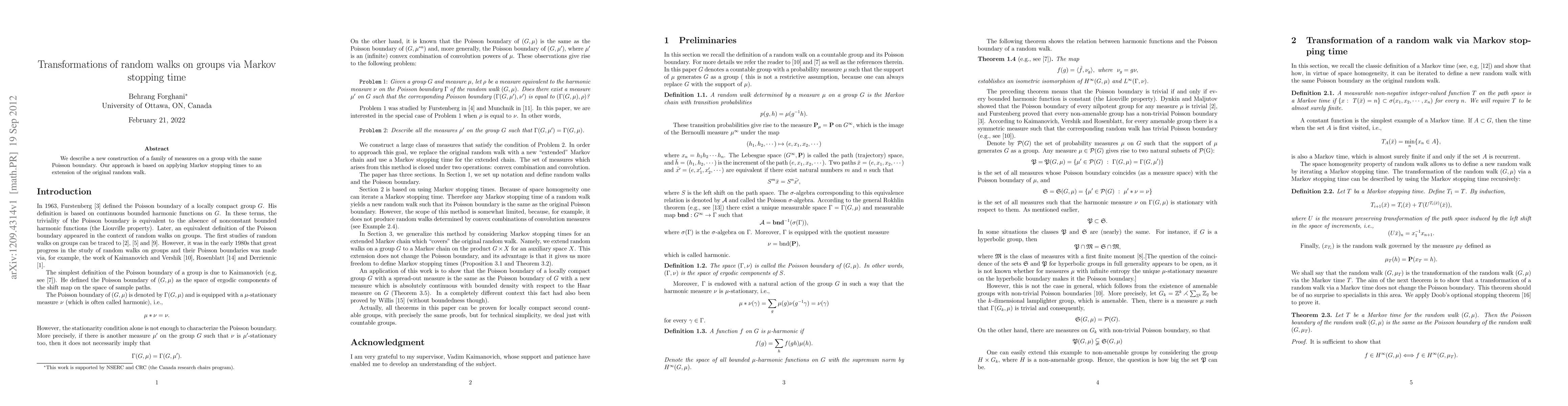 This paper introduces a new method for constructing measures on groups with the same Poisson boundary, using Markov stopping times applied to an extended random walk.