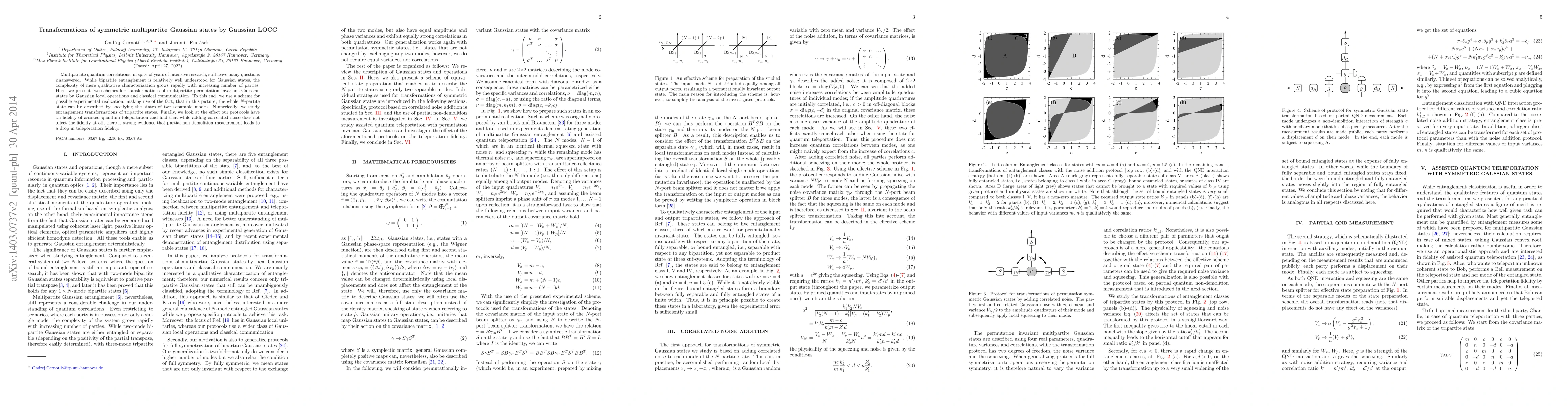 This research introduces methods for transforming multipartite Gaussian states via Gaussian local operations and classical communication, focusing on permutation-invariant states. Numerical analysis of tripartite state transformations reveals that while adding correlated noise doesn't impact teleportation fidelity, partial non-demolition measurements can decrease it.