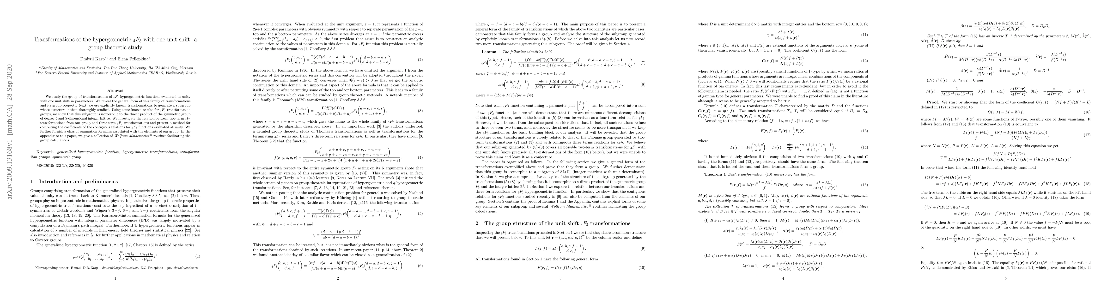We study the group of transformations of 4F3 hypergeometric functions evaluated at unity with one unit shift in parameters. We reveal the general form of this family of transformations and its group property. Next, we use explicitly known transformations to generate a subgroup whose structure is then thoroughly studied. Using some known results for 3F2 transformation groups, we show that this subgroup is isomorphic to the direct product of the symmetric group of degree 5 and 5-dimensional integer lattice. We investigate the relation between two-term 4F3 transformations from our group and three-term 3F2 transformations and present a method for computing the coefficients of the contiguous relations for 3F2 functions evaluated at unity. We further furnish a class of summation formulas associated with the elements of our group. In the appendix to this paper, we give a collection of Wolfram Mathematica routines facilitating the group calculations.