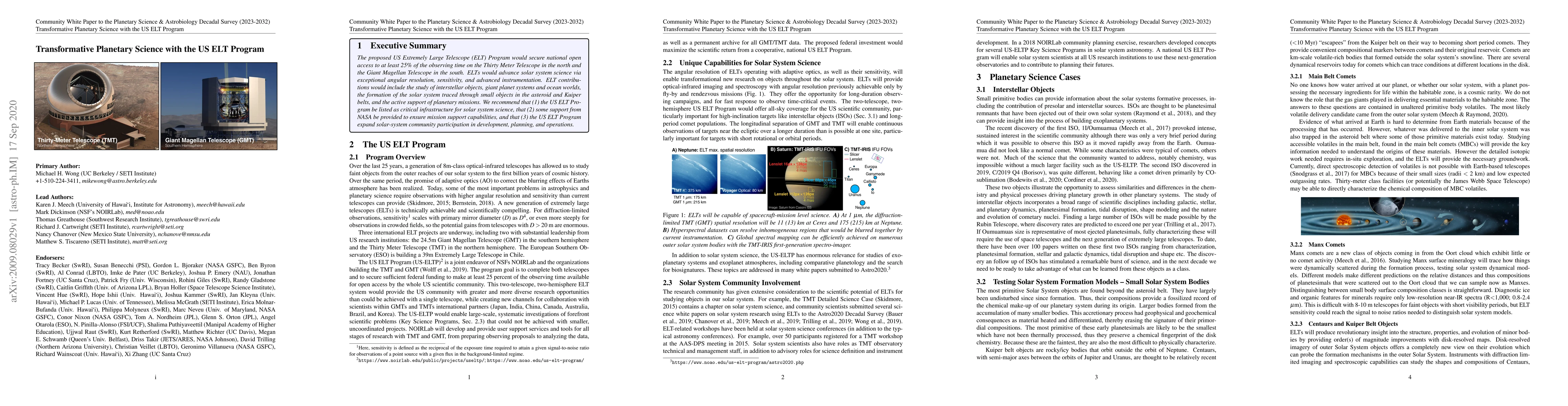 The US ELT Program aims to secure national open access to the Thirty Meter and Giant Magellan Telescopes, enhancing solar system science through superior resolution and instrumentation. Recommendations include listing the program as critical infrastructure, securing NASA support, and expanding community participation.