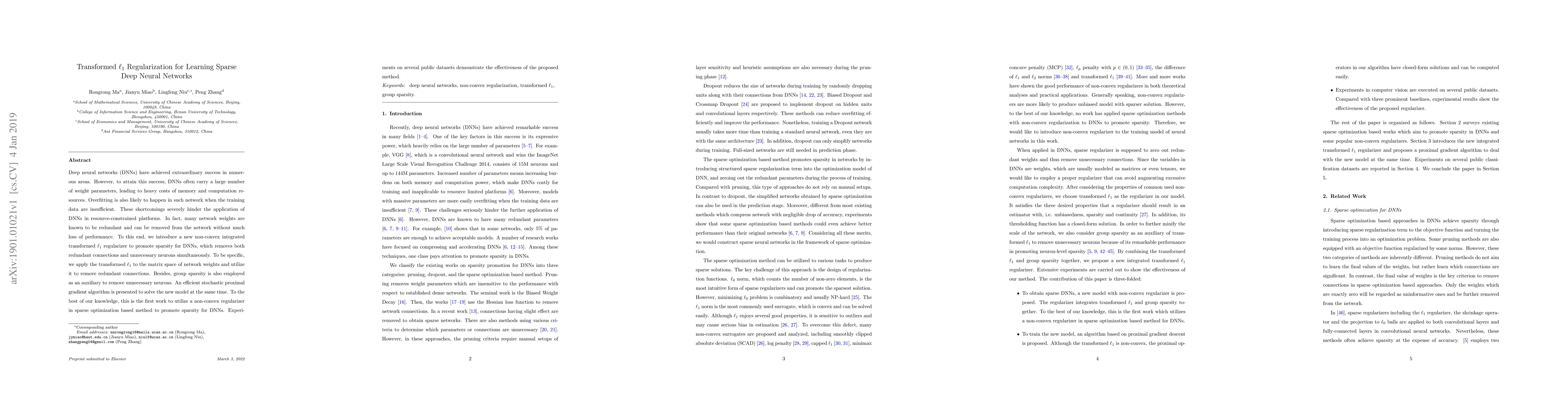 This paper introduces a novel non-convex transformed $\ell_1$ regularization method to promote sparsity in deep neural networks (DNNs), effectively removing redundant connections and neurons. An efficient stochastic proximal gradient algorithm is developed to solve the new model, demonstrating improved performance on public datasets.