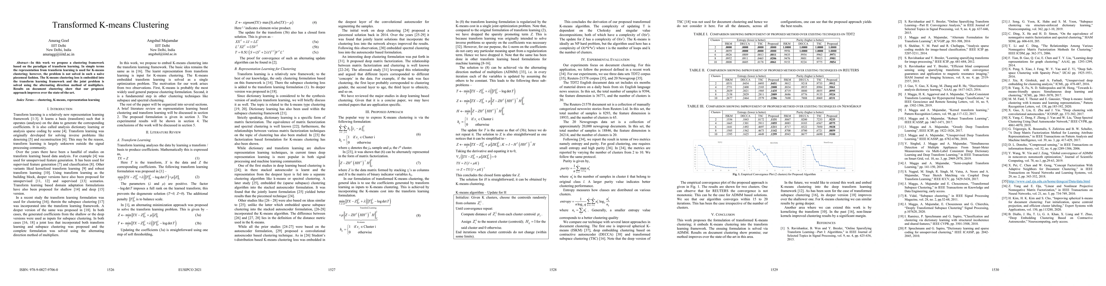This paper proposes a novel clustering framework that integrates transform learning with K-means clustering, embedding the clustering loss into the transform learning process and solving it jointly using the alternating direction method of multipliers. The approach demonstrates superior performance in document clustering compared to state-of-the-art methods.