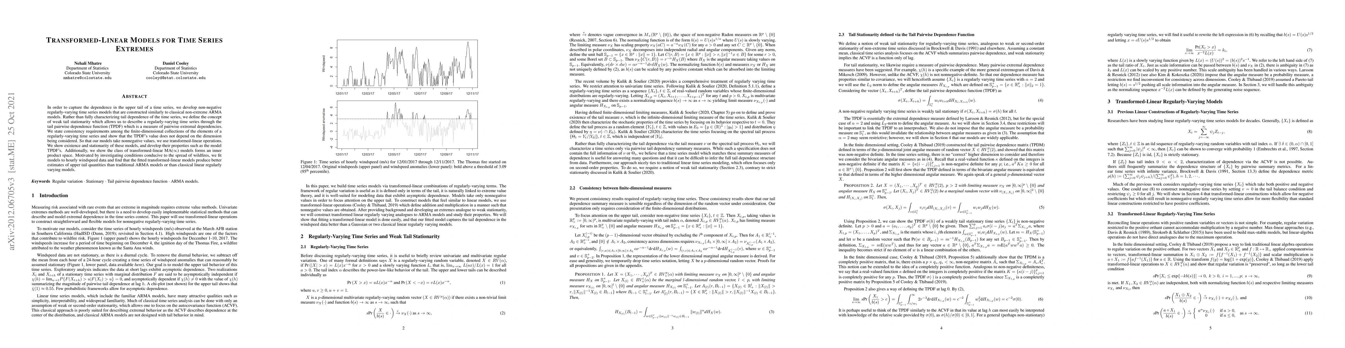 In order to capture the dependence in the upper tail of a time series, we develop non-negative regularly-varying time series models that are constructed similarly to classical non-extreme ARMA models. Rather than fully characterizing tail dependence of the time series, we define the concept of weak tail stationarity which allows us to describe a regularly-varying time series through the tail pairwise dependence function (TPDF) which is a measure of pairwise extremal dependencies. We state consistency requirements among the finite-dimensional collections of the elements of a regularly-varying time series and show that the TPDF's value does not depend on the dimension being considered. So that our models take nonnegative values, we use transformed-linear operations. We show existence and stationarity of these models, and develop their properties such as the model TPDF's. Additionally, we show the class of transformed-linear MA($\infty$) models forms an inner product space. Motivated by investigating conditions conducive to the spread of wildfires, we fit models to hourly windspeed data and find that the fitted transformed-linear models produce better estimates of upper tail quantities than traditional ARMA models or than classical linear regularly varying models.
