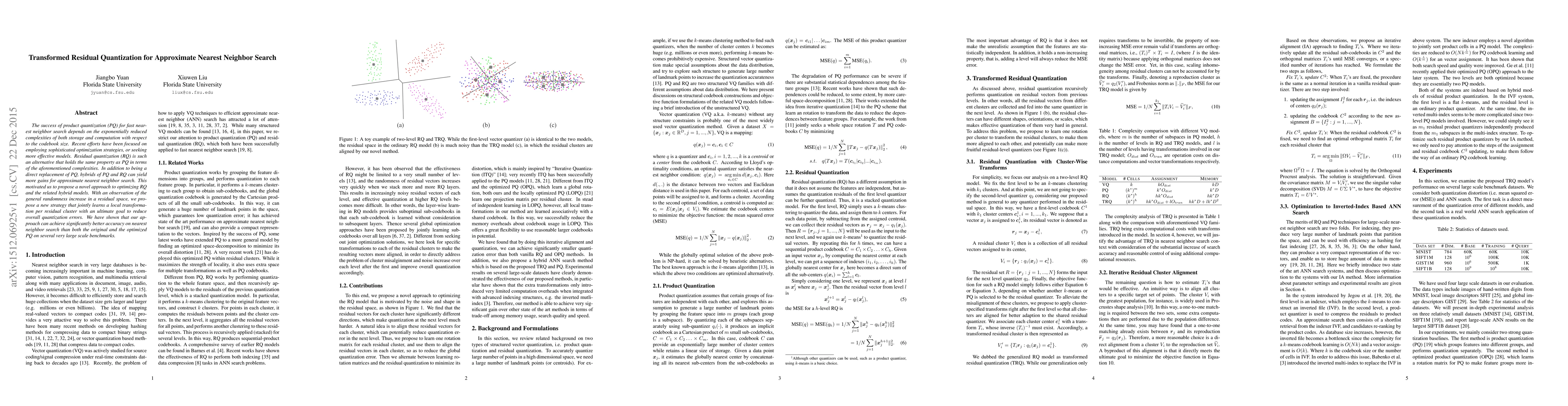 This paper proposes a novel transformed residual quantization method for approximate nearest neighbor search, which optimizes residual quantization by learning local transformations per residual cluster to reduce quantization errors. The approach achieves significantly better accuracy compared to both original and optimized product quantization on large-scale benchmarks.