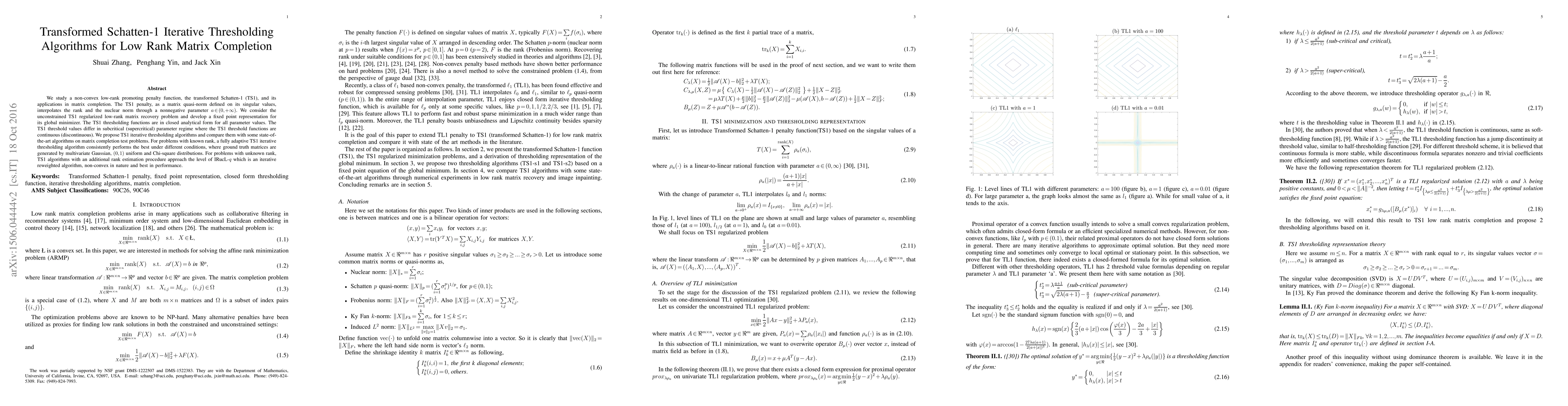 This paper introduces the transformed Schatten-1 (TS1) penalty for low-rank matrix completion, developing TS1 iterative thresholding algorithms. The TS1 penalty interpolates between rank and nuclear norm, and the proposed algorithms outperform state-of-the-art methods for both known and estimated rank scenarios.