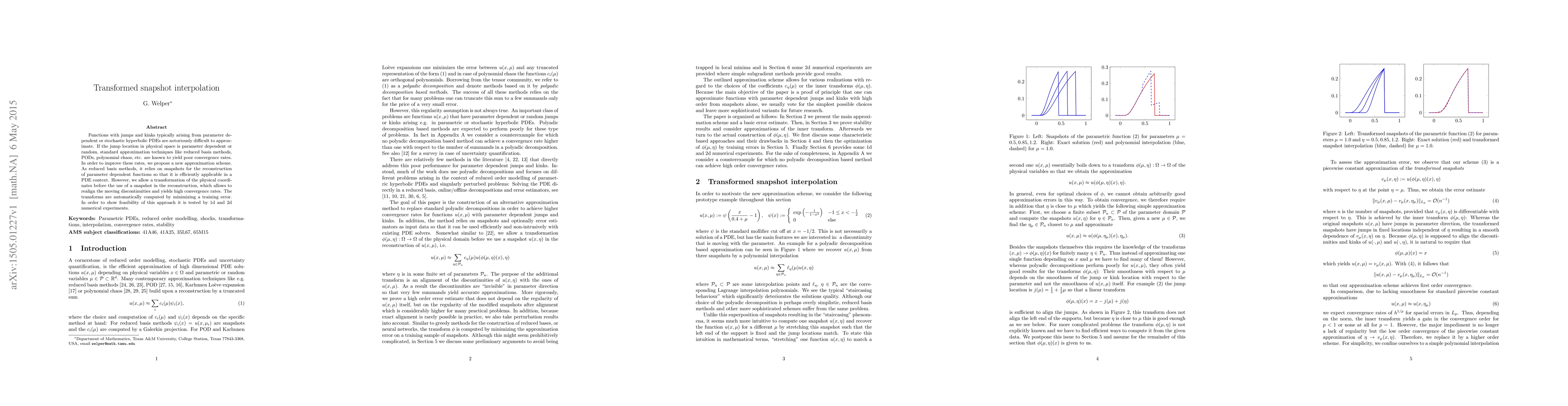 Functions with jumps and kinks typically arising from parameter dependent or stochastic hyperbolic PDEs are notoriously difficult to approximate. If the jump location in physical space is parameter dependent or random, standard approximation techniques like reduced basis methods, PODs, polynomial chaos, etc. are known to yield poor convergence rates. In order to improve these rates, we propose a new approximation scheme. As reduced basis methods, it relies on snapshots for the reconstruction of parameter dependent functions so that it is efficiently applicable in a PDE context. However, we allow a transformation of the physical coordinates before the use of a snapshot in the reconstruction, which allows to realign the moving discontinuities and yields high convergence rates. The transforms are automatically computed by minimizing a training error. In order to show feasibility of this approach it is tested by 1d and 2d numerical experiments.