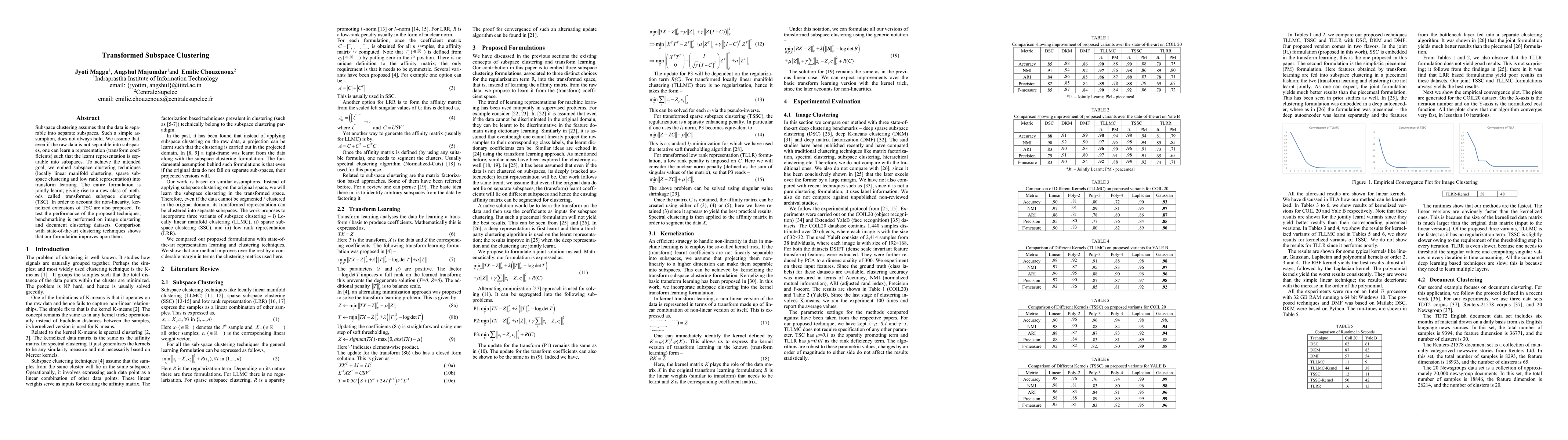 This paper proposes transformed subspace clustering (TSC) to handle non-separable data by learning a representation that makes it separable into subspaces. It integrates subspace clustering techniques with transform learning and kernelized extensions to improve performance, which is validated through benchmarking on image and document clustering datasets.