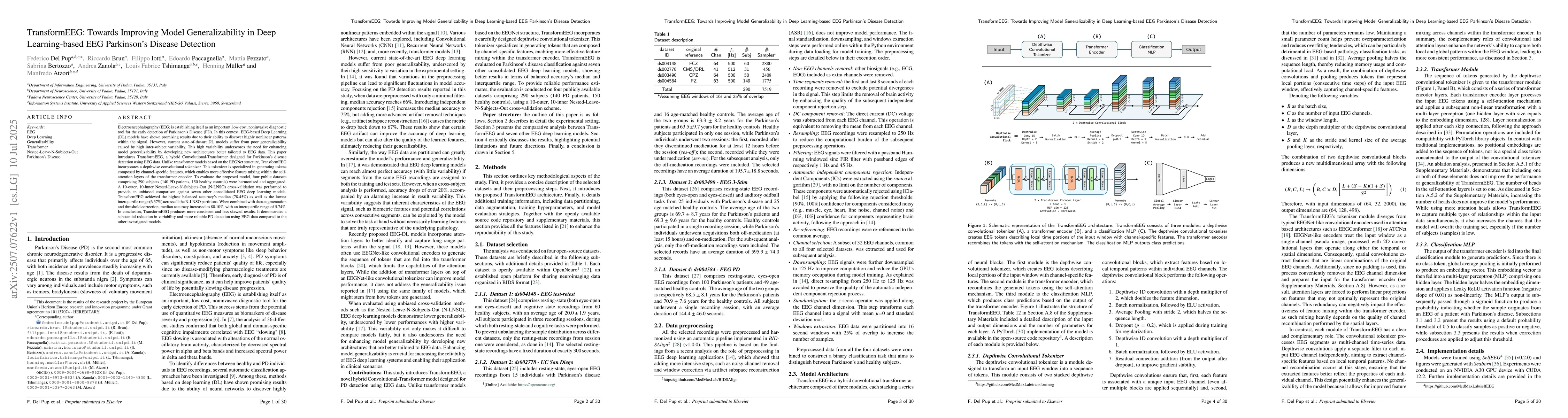Electroencephalography (EEG) is establishing itself as an important, low-cost, noninvasive diagnostic tool for the early detection of Parkinson's Disease (PD). In this context, EEG-based Deep Learning (DL) models have shown promising results due to their ability to discover highly nonlinear patterns within the signal. However, current state-of-the-art DL models suffer from poor generalizability caused by high inter-subject variability. This high variability underscores the need for enhancing model generalizability by developing new architectures better tailored to EEG data. This paper introduces TransformEEG, a hybrid Convolutional-Transformer designed for Parkinson's disease detection using EEG data. Unlike transformer models based on the EEGNet structure, TransformEEG incorporates a depthwise convolutional tokenizer. This tokenizer is specialized in generating tokens composed by channel-specific features, which enables more effective feature mixing within the self-attention layers of the transformer encoder. To evaluate the proposed model, four public datasets comprising 290 subjects (140 PD patients, 150 healthy controls) were harmonized and aggregated. A 10-outer, 10-inner Nested-Leave-N-Subjects-Out (N-LNSO) cross-validation was performed to provide an unbiased comparison against seven other consolidated EEG deep learning models. TransformEEG achieved the highest balanced accuracy's median (78.45%) as well as the lowest interquartile range (6.37%) across all the N-LNSO partitions. When combined with data augmentation and threshold correction, median accuracy increased to 80.10%, with an interquartile range of 5.74%. In conclusion, TransformEEG produces more consistent and less skewed results. It demonstrates a substantial reduction in variability and more reliable PD detection using EEG data compared to the other investigated models.