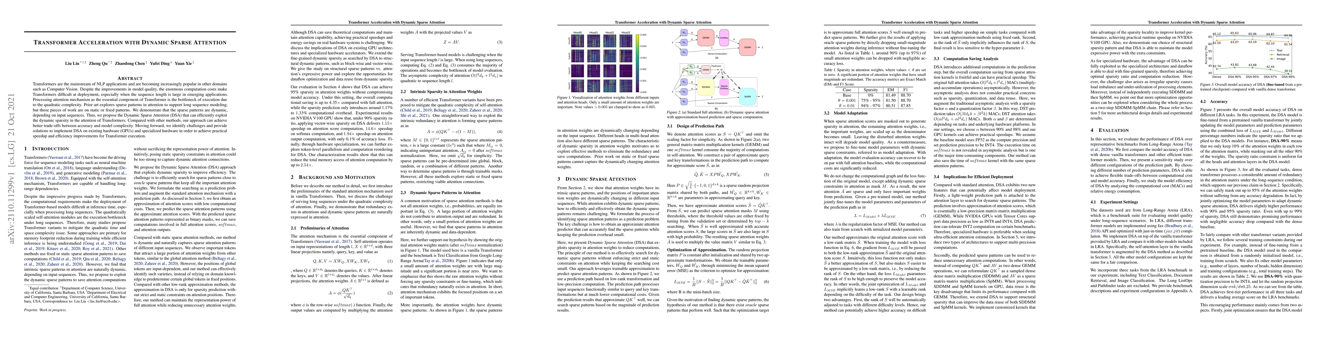 This paper proposes Dynamic Sparse Attention (DSA) to address the computational bottleneck of Transformers, particularly for long sequences. DSA dynamically adjusts sparse patterns based on input sequences, achieving a better balance between accuracy and efficiency compared to static sparse methods.