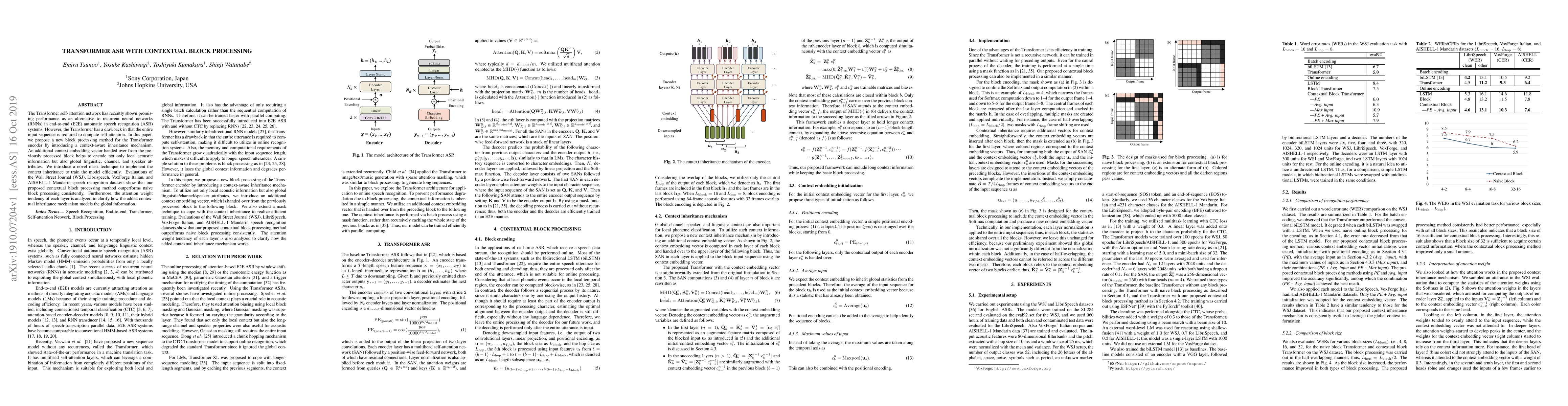 Researchers improved speech recognition performance with a Transformer model using contextual block processing, which incorporates global linguistic information into local acoustic analysis, outperforming baseline methods on multiple datasets.