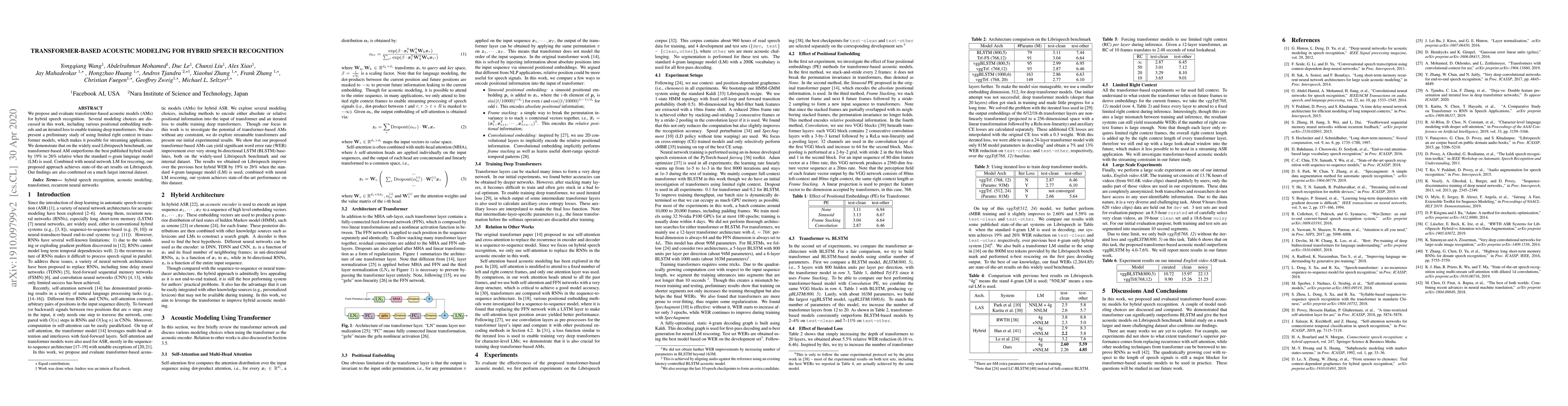 This paper proposes transformer-based acoustic models for hybrid speech recognition, achieving superior results on Librispeech compared to the best published hybrid methods, and demonstrates state-of-the-art performance when combined with neural network language models. The study also explores limited right context for streaming applications.