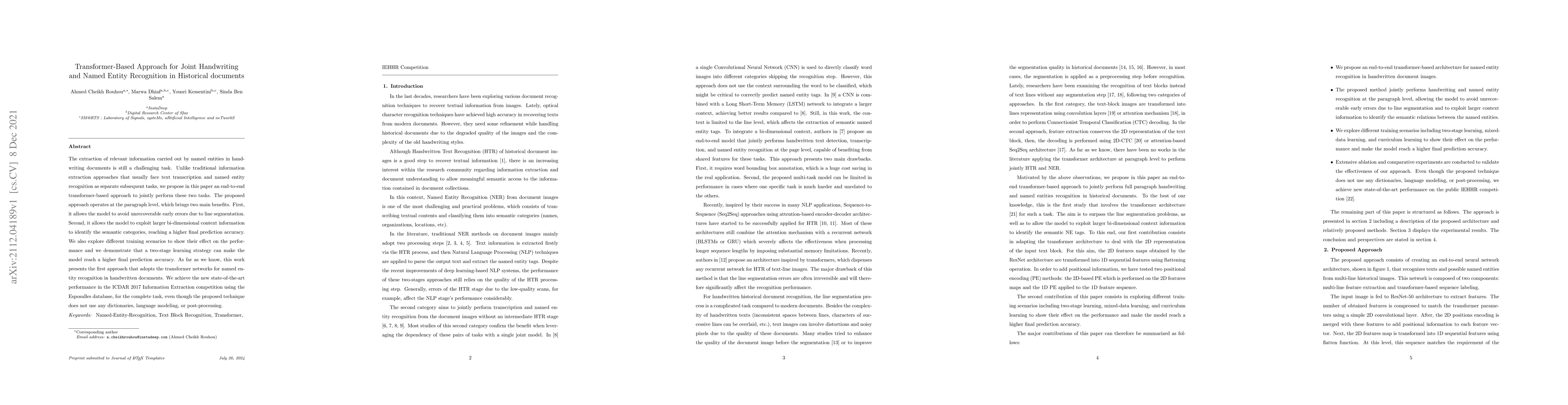 This paper proposes a transformer-based end-to-end approach for jointly recognizing named entities and transcribing handwriting in historical documents, achieving state-of-the-art results without dictionaries or language models. The method operates at the paragraph level to avoid early errors and leverage large contextual information for higher accuracy.