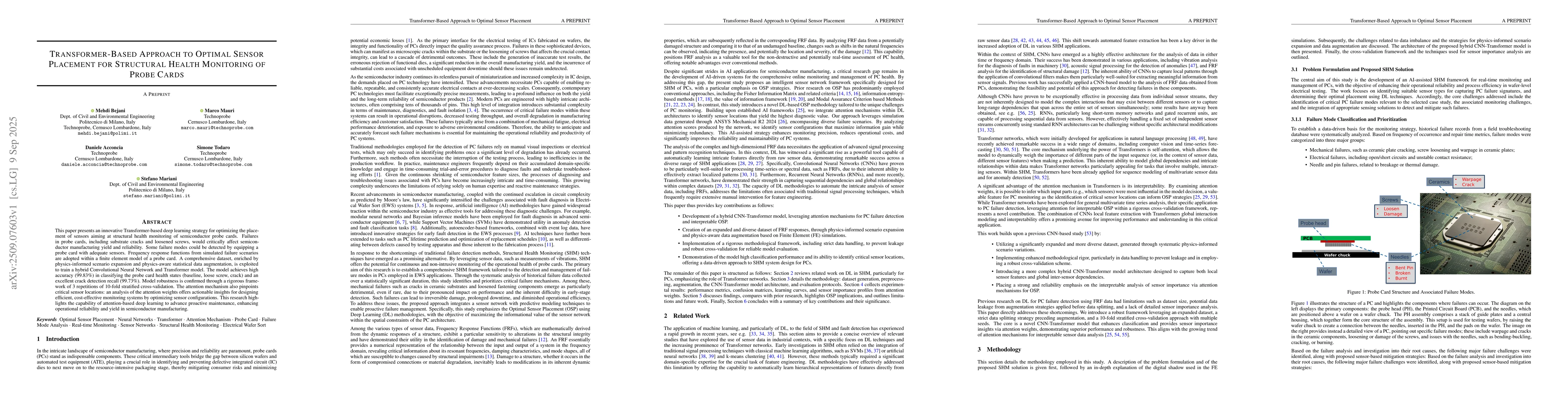 This paper presents an innovative Transformer-based deep learning strategy for optimizing the placement of sensors aiming at structural health monitoring of semiconductor probe cards. Failures in probe cards, including substrate cracks and loosened screws, would critically affect semiconductor manufacturing yield and reliability. Some failure modes could be detected by equipping a probe card with adequate sensors. Frequency response functions from simulated failure scenarios are adopted within a finite element model of a probe card. A comprehensive dataset, enriched by physics-informed scenario expansion and physics-aware statistical data augmentation, is exploited to train a hybrid Convolutional Neural Network and Transformer model. The model achieves high accuracy (99.83%) in classifying the probe card health states (baseline, loose screw, crack) and an excellent crack detection recall (99.73%). Model robustness is confirmed through a rigorous framework of 3 repetitions of 10-fold stratified cross-validation. The attention mechanism also pinpoints critical sensor locations: an analysis of the attention weights offers actionable insights for designing efficient, cost-effective monitoring systems by optimizing sensor configurations. This research highlights the capability of attention-based deep learning to advance proactive maintenance, enhancing operational reliability and yield in semiconductor manufacturing.