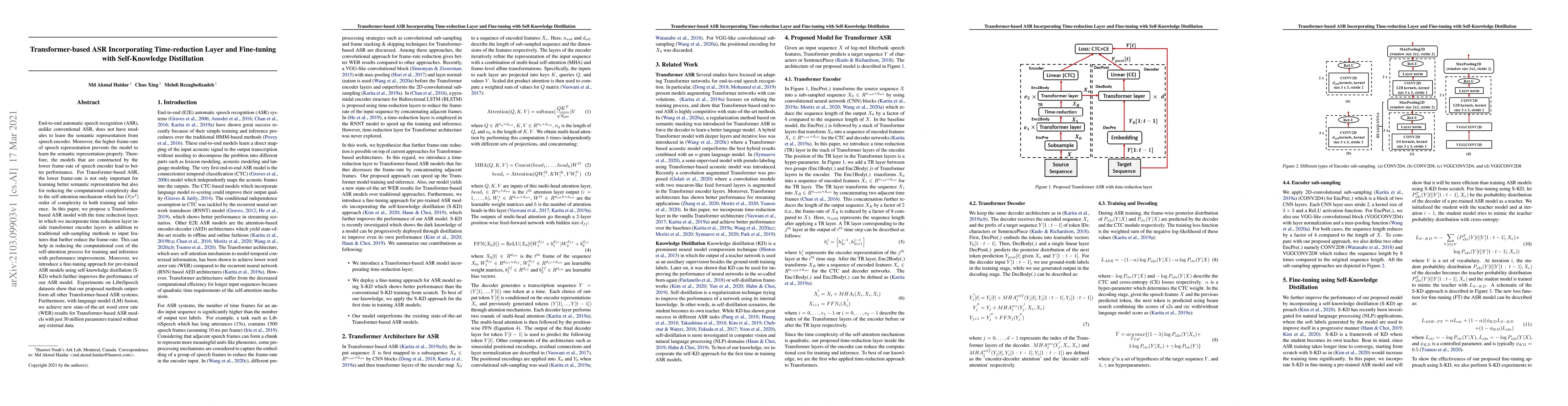 This paper proposes a Transformer-based ASR model with time reduction layer to reduce computational complexity and improves performance using self-knowledge distillation, achieving state-of-the-art results on LibriSpeech datasets.
