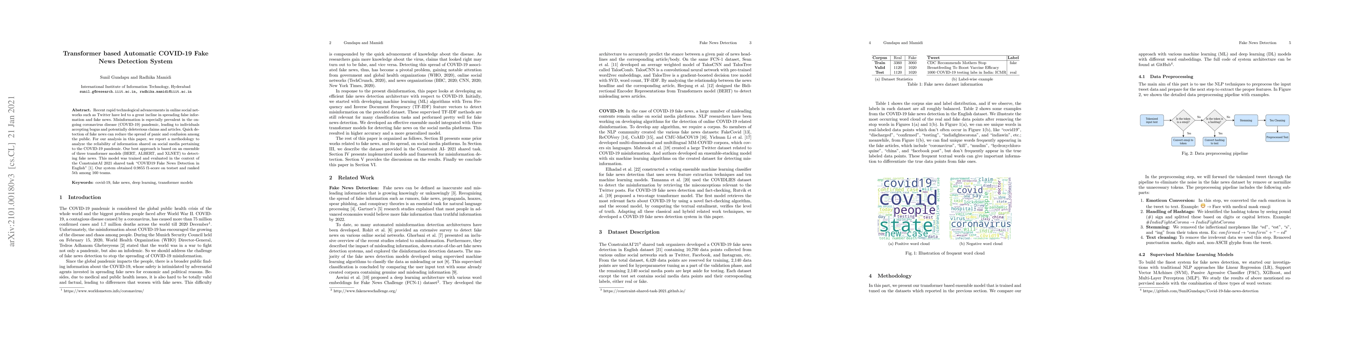 Recent rapid technological advancements in online social networks such as Twitter have led to a great incline in spreading false information and fake news. Misinformation is especially prevalent in the ongoing coronavirus disease (COVID-19) pandemic, leading to individuals accepting bogus and potentially deleterious claims and articles. Quick detection of fake news can reduce the spread of panic and confusion among the public. For our analysis in this paper, we report a methodology to analyze the reliability of information shared on social media pertaining to the COVID-19 pandemic. Our best approach is based on an ensemble of three transformer models (BERT, ALBERT, and XLNET) to detecting fake news. This model was trained and evaluated in the context of the ConstraintAI 2021 shared task COVID19 Fake News Detection in English. Our system obtained 0.9855 f1-score on testset and ranked 5th among 160 teams.