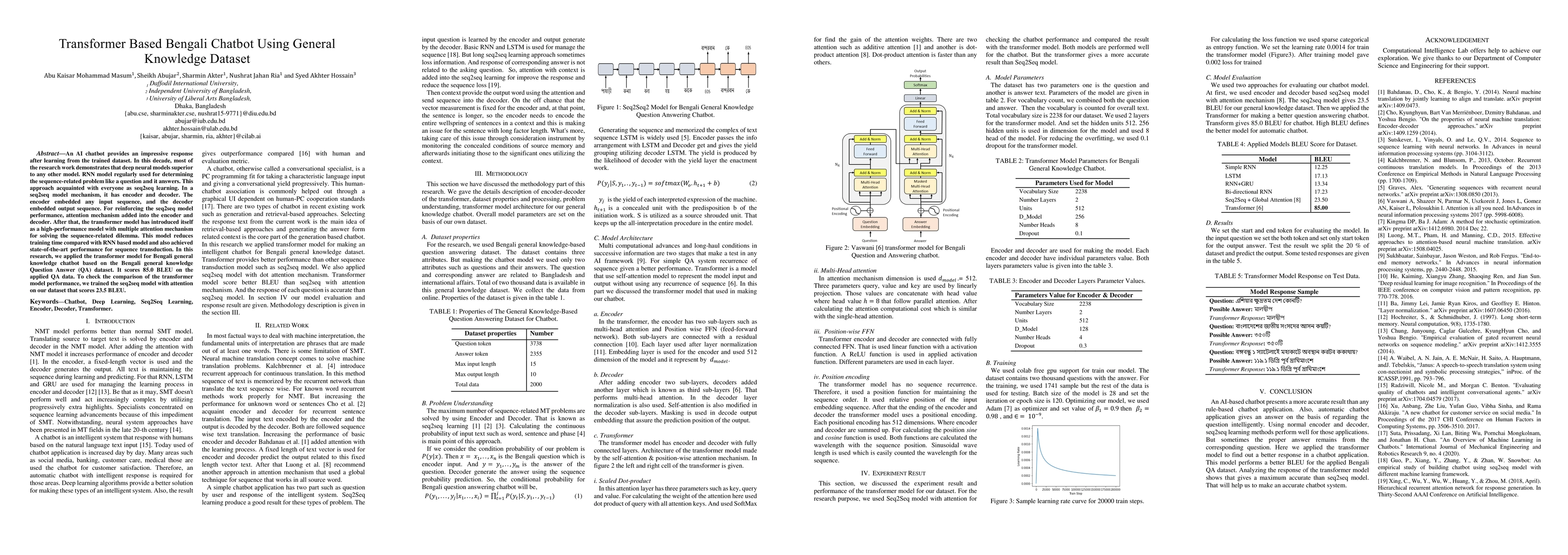 This research develops a transformer-based Bengali chatbot using a general knowledge dataset, achieving a BLEU score of 85.0, significantly outperforming a comparable seq2seq model with attention that scored 23.5.