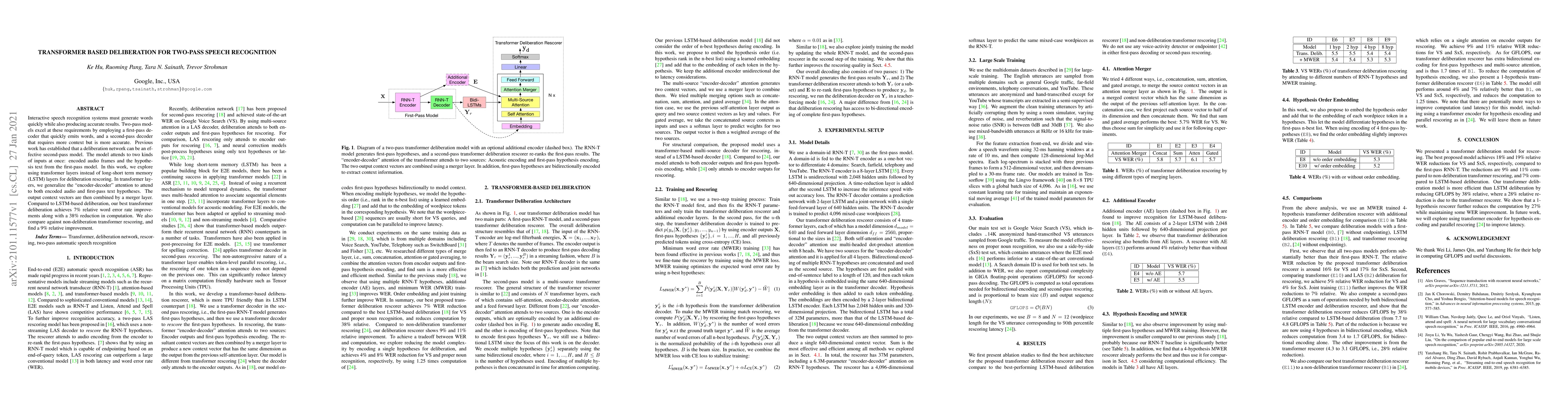 This paper proposes a transformer-based deliberation network for two-pass speech recognition, achieving a 7% relative word error rate improvement and 38% reduction in computation compared to LSTM-based models. The transformer deliberation rescores hypotheses from a first-pass decoder, combining encoded audio and text inputs for enhanced accuracy.