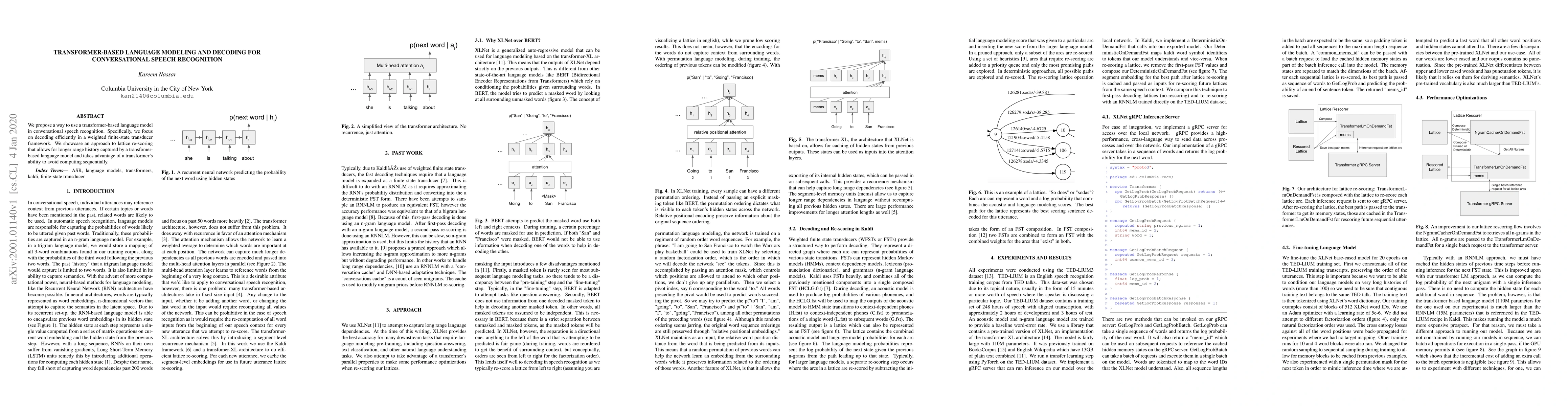 We propose a way to use a transformer-based language model in conversational speech recognition. Specifically, we focus on decoding efficiently in a weighted finite-state transducer framework. We showcase an approach to lattice re-scoring that allows for longer range history captured by a transfomer-based language model and takes advantage of a transformer's ability to avoid computing sequentially.