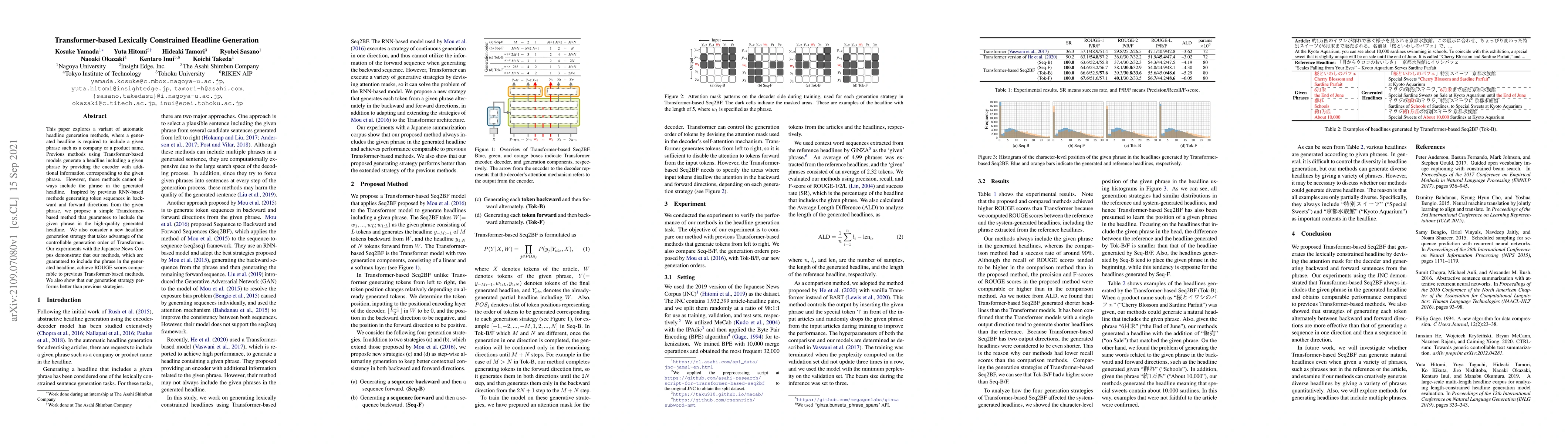 This paper proposes a Transformer-based method to generate headlines that must include a specified phrase, improving on previous methods that often fail to include the phrase. The new approach leverages the controllable generation order of Transformers to guarantee phrase inclusion, achieving comparable ROUGE scores while outperforming previous strategies.