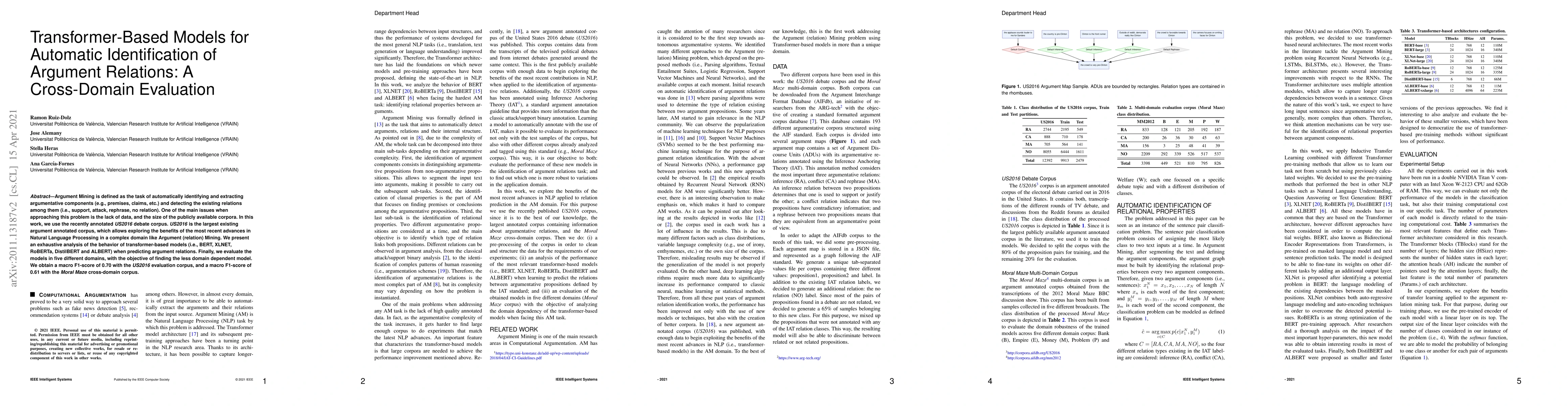 Argument Mining is defined as the task of automatically identifying and extracting argumentative components (e.g., premises, claims, etc.) and detecting the existing relations among them (i.e., support, attack, rephrase, no relation). One of the main issues when approaching this problem is the lack of data, and the size of the publicly available corpora. In this work, we use the recently annotated US2016 debate corpus. US2016 is the largest existing argument annotated corpus, which allows exploring the benefits of the most recent advances in Natural Language Processing in a complex domain like Argument (relation) Mining. We present an exhaustive analysis of the behavior of transformer-based models (i.e., BERT, XLNET, RoBERTa, DistilBERT and ALBERT) when predicting argument relations. Finally, we evaluate the models in five different domains, with the objective of finding the less domain dependent model. We obtain a macro F1-score of 0.70 with the US2016 evaluation corpus, and a macro F1-score of 0.61 with the Moral Maze cross-domain corpus.