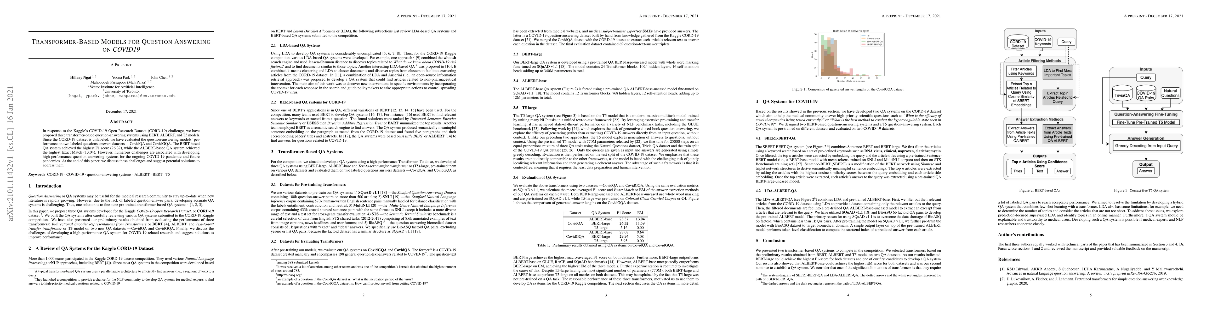 This paper proposes three transformer-based question-answering systems using BERT, ALBERT, and T5 models to tackle the COVID-19 Open Research Dataset challenge. The BERT-based system achieved the highest F1 score, while the ALBERT-based system had the best Exact Match, highlighting the challenges and suggesting solutions for future pandemics.