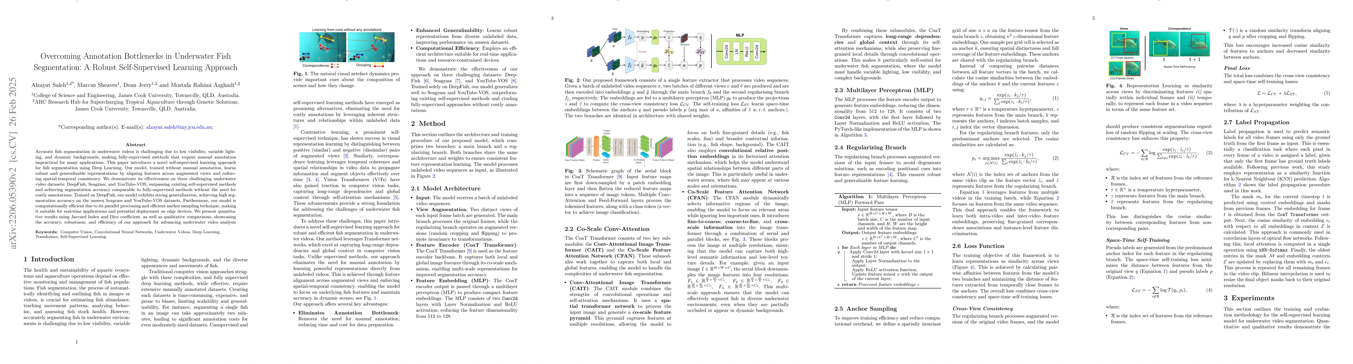 This paper proposes a Transformer-based self-supervised learning method for fish segmentation in underwater videos, trained without any annotations. The model demonstrates superior performance compared to previous self-supervised and supervised methods, showcasing high generalizability and computational efficiency.