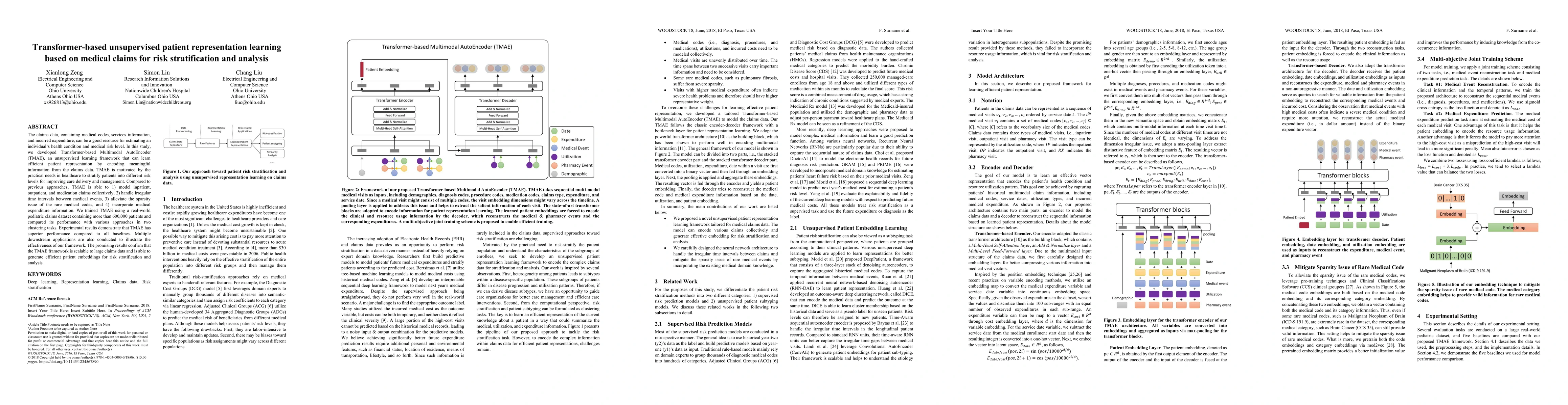 This paper introduces TMAE, a Transformer-based unsupervised learning framework for deriving patient representations from medical claims data. TMAE effectively models diverse claim types, handles irregular intervals, and incorporates medical expenditure, demonstrating superior performance in risk stratification compared to baseline methods.