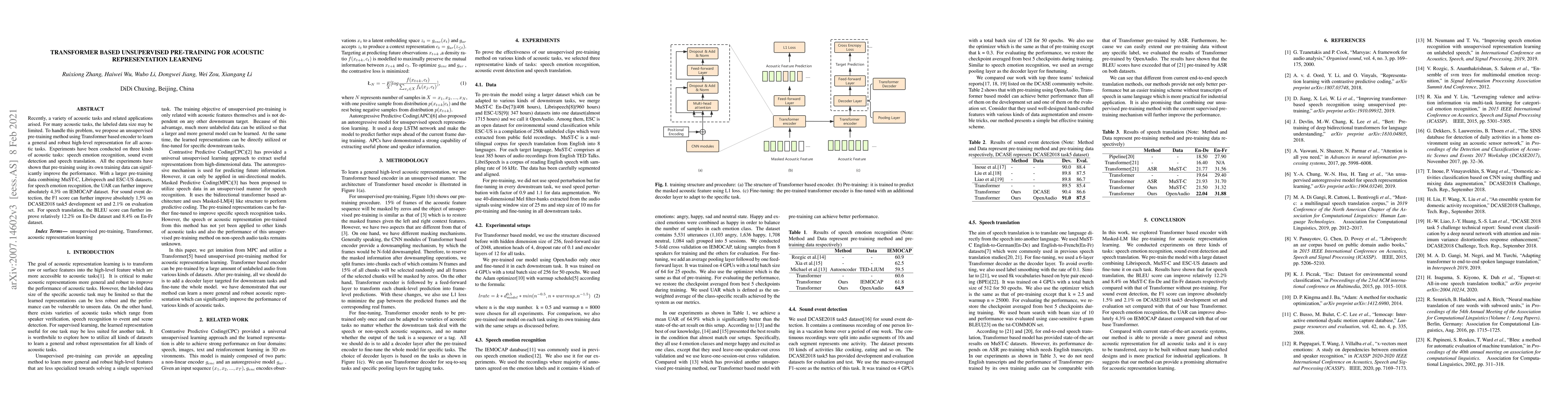 This paper proposes an unsupervised pre-training method using a Transformer-based encoder to learn robust acoustic representations for various tasks. Experiments on speech emotion recognition, sound event detection, and speech translation show significant performance improvements, especially with larger pre-training data.