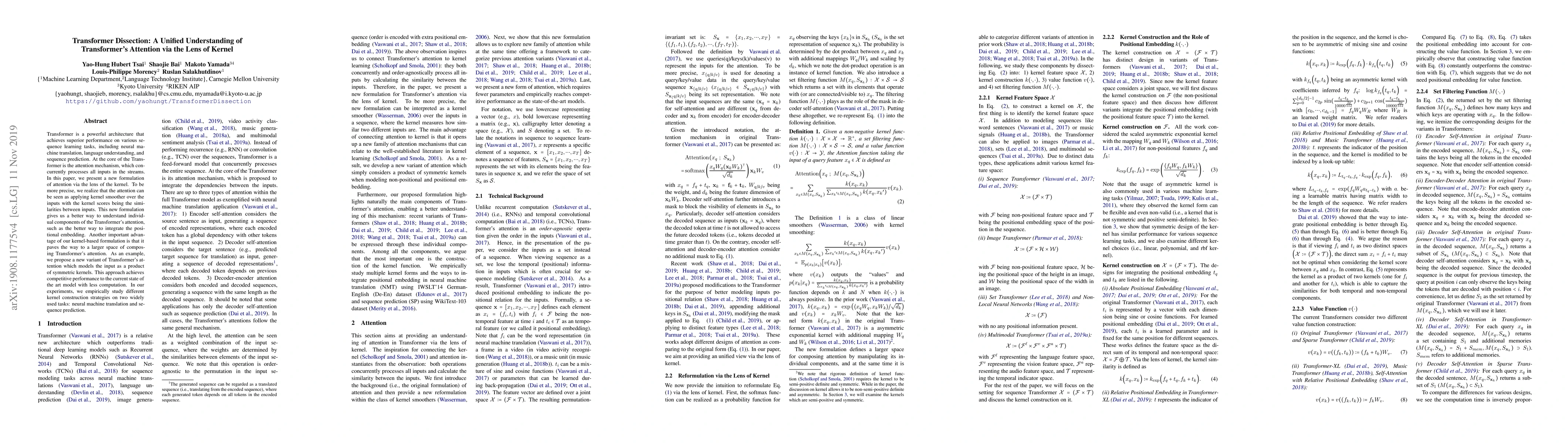 Transformer is a powerful architecture that achieves superior performance on various sequence learning tasks, including neural machine translation, language understanding, and sequence prediction. At the core of the Transformer is the attention mechanism, which concurrently processes all inputs in the streams. In this paper, we present a new formulation of attention via the lens of the kernel. To be more precise, we realize that the attention can be seen as applying kernel smoother over the inputs with the kernel scores being the similarities between inputs. This new formulation gives us a better way to understand individual components of the Transformer's attention, such as the better way to integrate the positional embedding. Another important advantage of our kernel-based formulation is that it paves the way to a larger space of composing Transformer's attention. As an example, we propose a new variant of Transformer's attention which models the input as a product of symmetric kernels. This approach achieves competitive performance to the current state of the art model with less computation. In our experiments, we empirically study different kernel construction strategies on two widely used tasks: neural machine translation and sequence prediction.