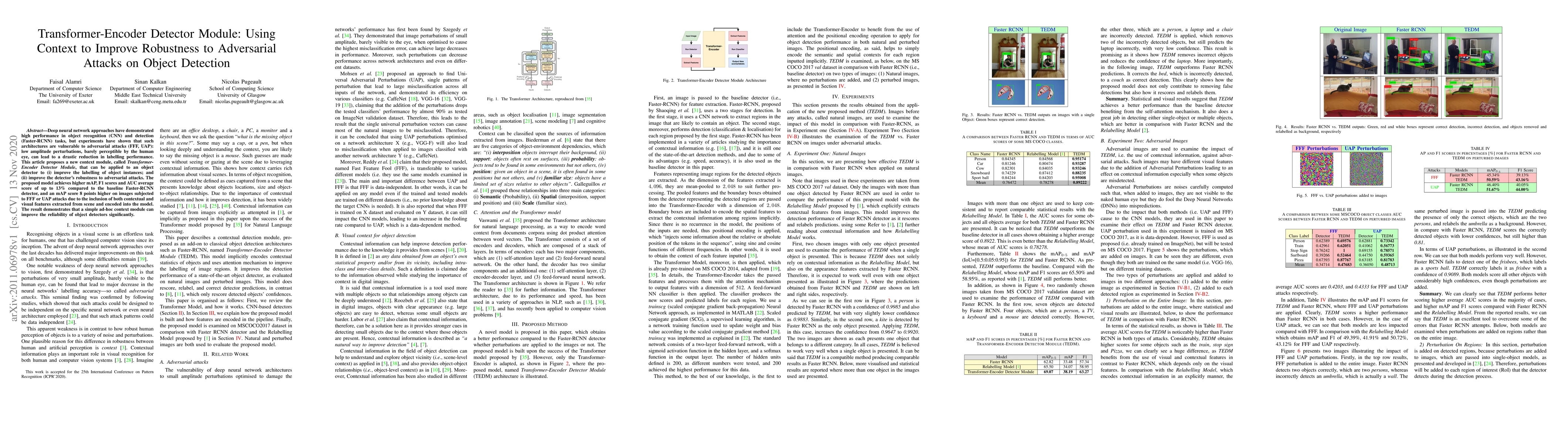 Deep neural network approaches have demonstrated high performance in object recognition (CNN) and detection (Faster-RCNN) tasks, but experiments have shown that such architectures are vulnerable to adversarial attacks (FFF, UAP): low amplitude perturbations, barely perceptible by the human eye, can lead to a drastic reduction in labeling performance. This article proposes a new context module, called \textit{Transformer-Encoder Detector Module}, that can be applied to an object detector to (i) improve the labeling of object instances; and (ii) improve the detector's robustness to adversarial attacks. The proposed model achieves higher mAP, F1 scores and AUC average score of up to 13\% compared to the baseline Faster-RCNN detector, and an mAP score 8 points higher on images subjected to FFF or UAP attacks due to the inclusion of both contextual and visual features extracted from scene and encoded into the model. The result demonstrates that a simple ad-hoc context module can improve the reliability of object detectors significantly.