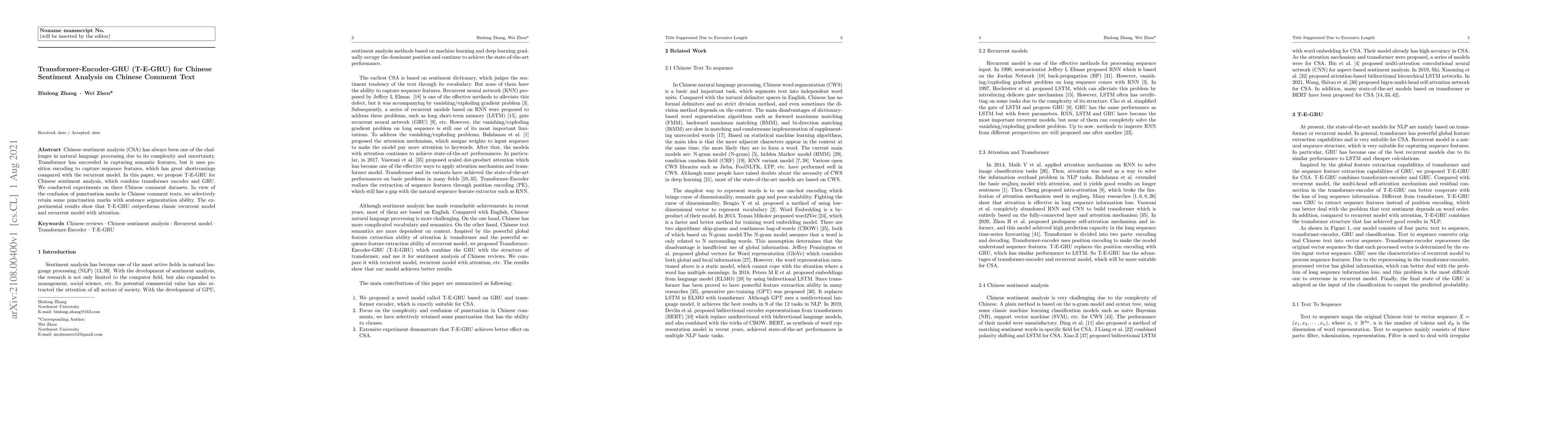 This paper proposes a Transformer-Encoder-GRU (T-E-GRU) model for Chinese sentiment analysis, combining the semantic feature extraction of Transformer with the sequence feature capture of GRU. Experiments on three datasets show that T-E-GRU outperforms traditional recurrent models and those with attention mechanisms.