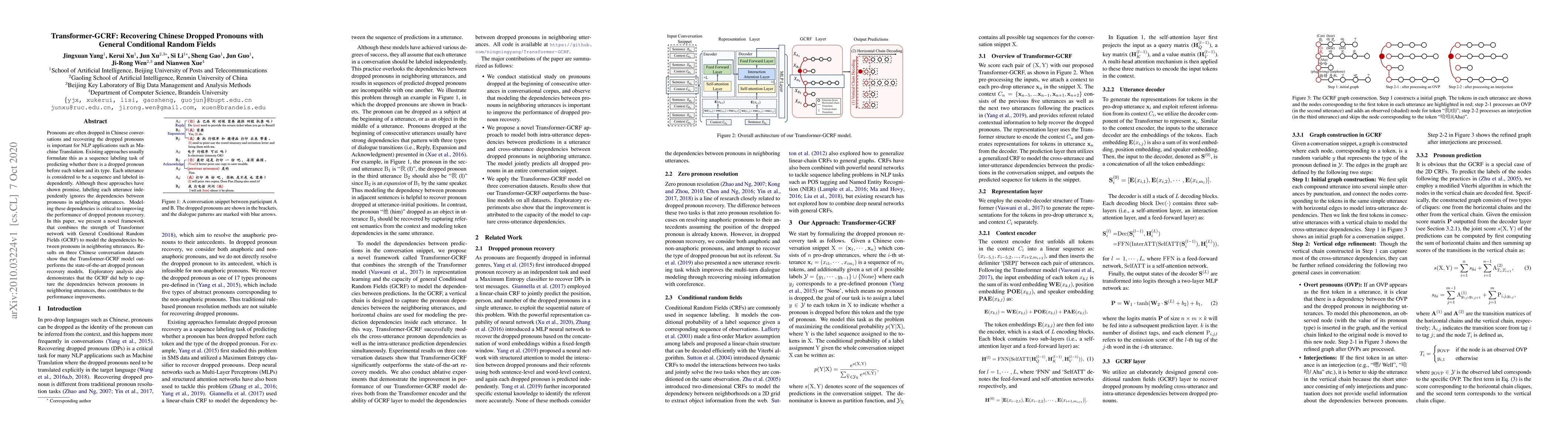This paper proposes a Transformer-GCRF framework to recover dropped pronouns in Chinese conversations, addressing the limitation of existing models that ignore dependencies between pronouns in neighboring utterances. The results show that the proposed model outperforms state-of-the-art methods, indicating that GCRF effectively captures these dependencies.