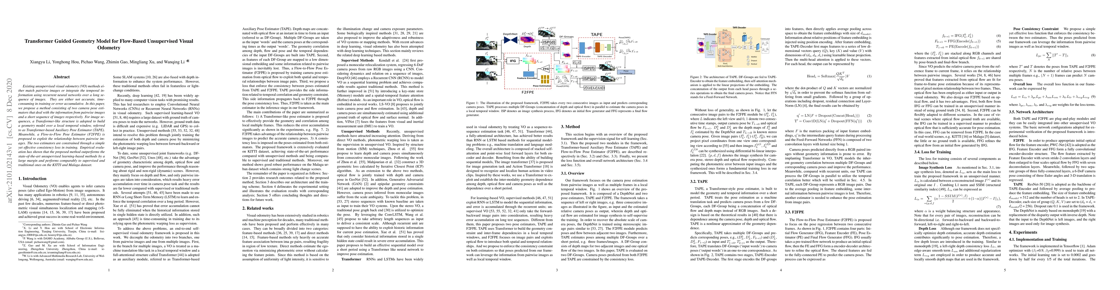 This paper proposes a novel Transformer-guided geometry model for flow-based unsupervised visual odometry, combining a Transformer-based Auxiliary Pose Estimator (TAPE) and a Flow-to-Flow Pose Estimator (F2FPE) to enhance accuracy and efficiency, outperforming state-of-the-art methods on KITTI and Malaga datasets.