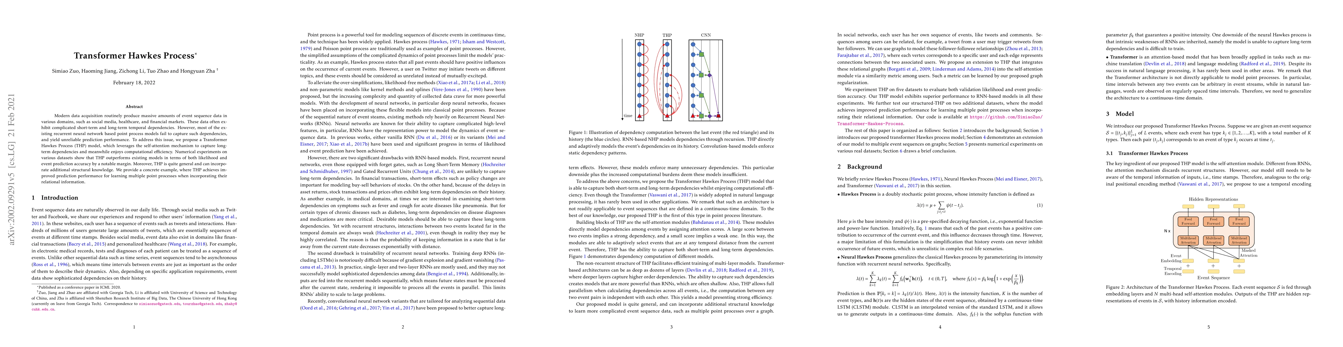 The Transformer Hawkes Process (THP) model leverages self-attention to capture long-term dependencies in event sequence data, outperforming existing recurrent neural network models in both likelihood and prediction accuracy. THP is also general and can incorporate additional structural knowledge, as demonstrated by its improved performance in learning multiple point processes with relational information.