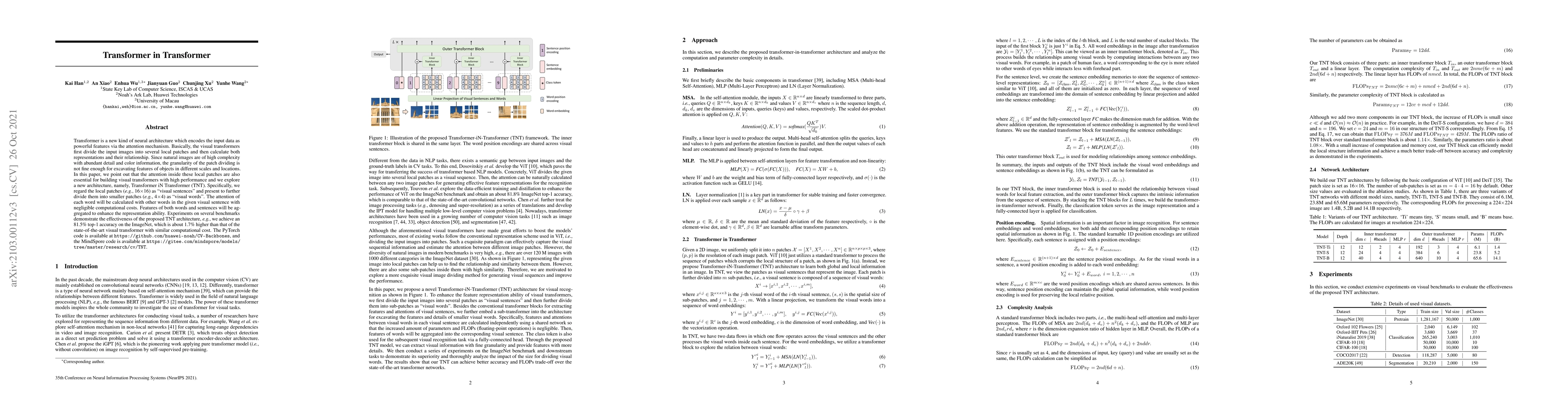 Researchers developed a new neural architecture called Transformer in Transformer (TNT) to improve visual transformer performance, achieving 81.5% top-1 accuracy on ImageNet with minimal computational cost.