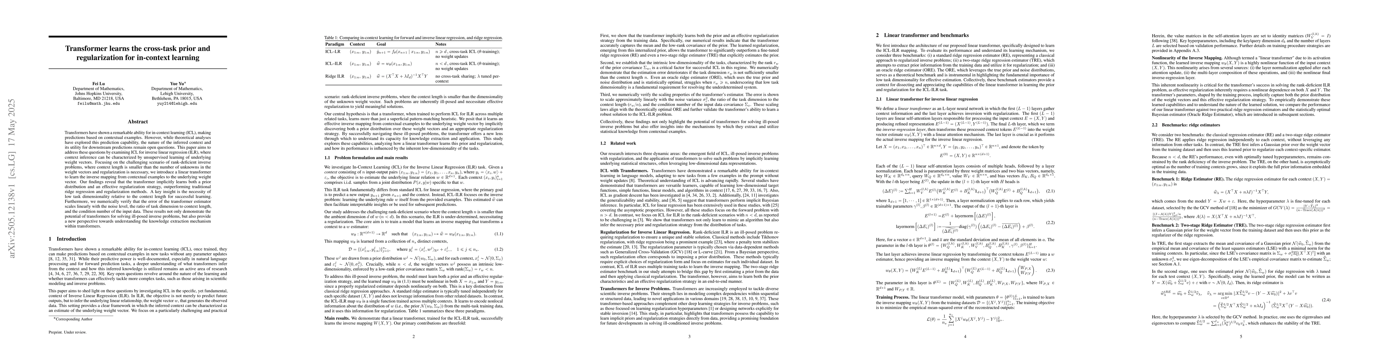 Transformers have shown a remarkable ability for in-context learning (ICL), making predictions based on contextual examples. However, while theoretical analyses have explored this prediction capability, the nature of the inferred context and its utility for downstream predictions remain open questions. This paper aims to address these questions by examining ICL for inverse linear regression (ILR), where context inference can be characterized by unsupervised learning of underlying weight vectors. Focusing on the challenging scenario of rank-deficient inverse problems, where context length is smaller than the number of unknowns in the weight vectors and regularization is necessary, we introduce a linear transformer to learn the inverse mapping from contextual examples to the underlying weight vector. Our findings reveal that the transformer implicitly learns both a prior distribution and an effective regularization strategy, outperforming traditional ridge regression and regularization methods. A key insight is the necessity of low task dimensionality relative to the context length for successful learning. Furthermore, we numerically verify that the error of the transformer estimator scales linearly with the noise level, the ratio of task dimension to context length, and the condition number of the input data. These results not only demonstrate the potential of transformers for solving ill-posed inverse problems, but also provide a new perspective towards understanding the knowledge extraction mechanism within transformers.