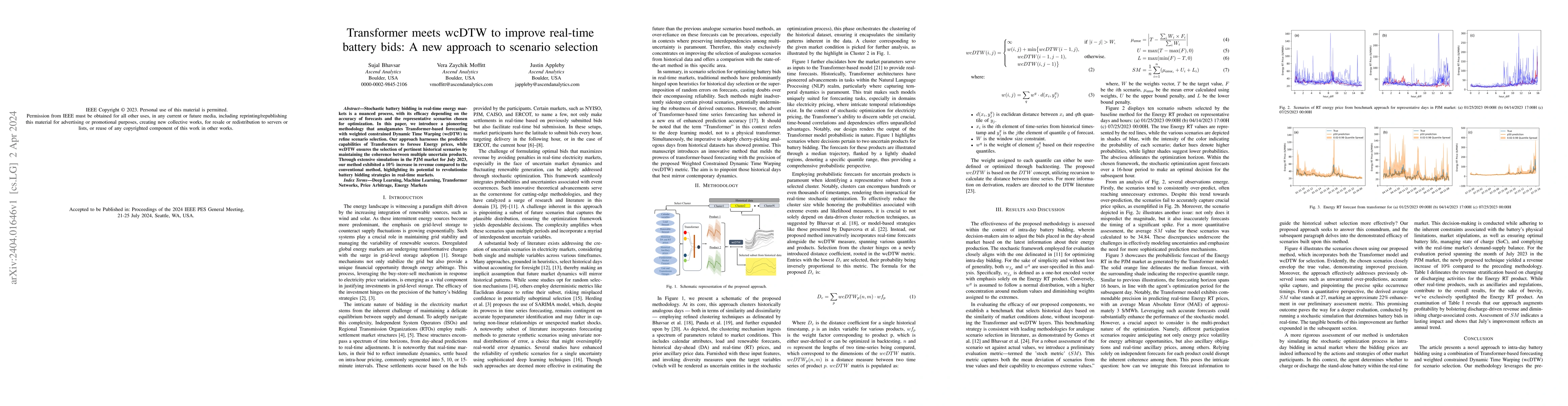 This paper proposes a novel methodology combining Transformer-based forecasting with weighted constrained Dynamic Time Warping (wcDTW) to enhance real-time battery bidding in energy markets. The approach optimizes scenario selection by predicting energy prices and choosing relevant historical scenarios, achieving a 10% revenue increase over conventional methods in PJM market simulations.