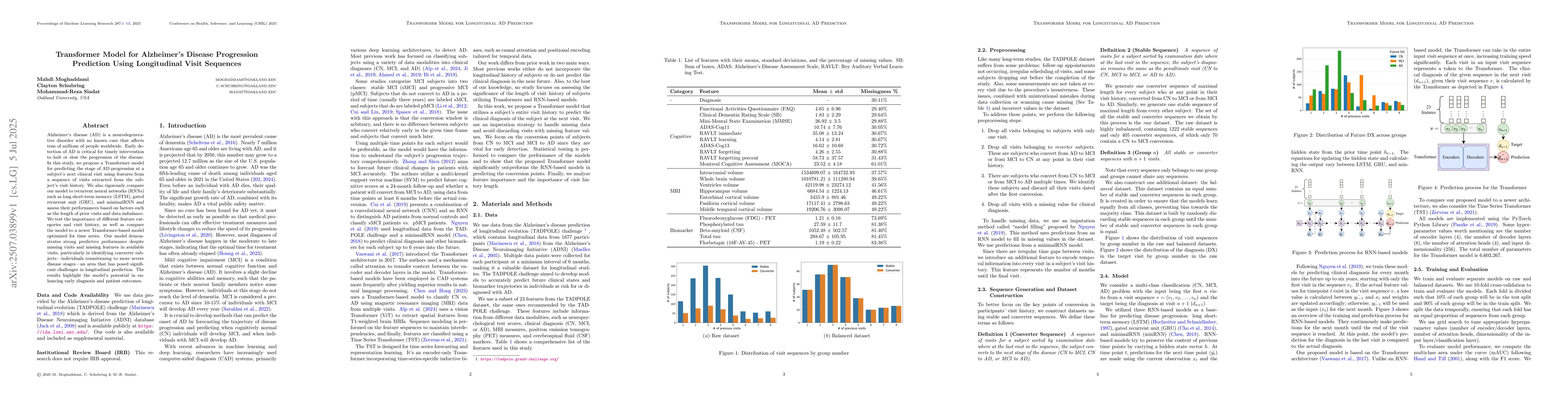 Alzheimer's disease (AD) is a neurodegenerative disorder with no known cure that affects tens of millions of people worldwide. Early detection of AD is critical for timely intervention to halt or slow the progression of the disease. In this study, we propose a Transformer model for predicting the stage of AD progression at a subject's next clinical visit using features from a sequence of visits extracted from the subject's visit history. We also rigorously compare our model to recurrent neural networks (RNNs) such as long short-term memory (LSTM), gated recurrent unit (GRU), and minimalRNN and assess their performances based on factors such as the length of prior visits and data imbalance. We test the importance of different feature categories and visit history, as well as compare the model to a newer Transformer-based model optimized for time series. Our model demonstrates strong predictive performance despite missing visits and missing features in available visits, particularly in identifying converter subjects -- individuals transitioning to more severe disease stages -- an area that has posed significant challenges in longitudinal prediction. The results highlight the model's potential in enhancing early diagnosis and patient outcomes.