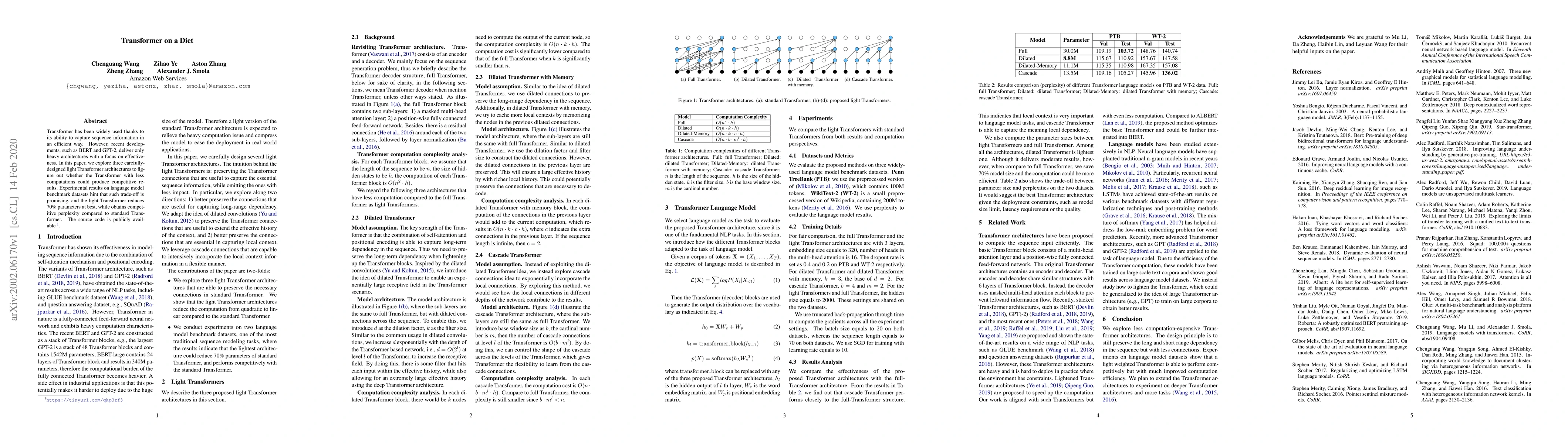 Transformer has been widely used thanks to its ability to capture sequence information in an efficient way. However, recent developments, such as BERT and GPT-2, deliver only heavy architectures with a focus on effectiveness. In this paper, we explore three carefully-designed light Transformer architectures to figure out whether the Transformer with less computations could produce competitive results. Experimental results on language model benchmark datasets hint that such trade-off is promising, and the light Transformer reduces 70% parameters at best, while obtains competitive perplexity compared to standard Transformer. The source code is publicly available.