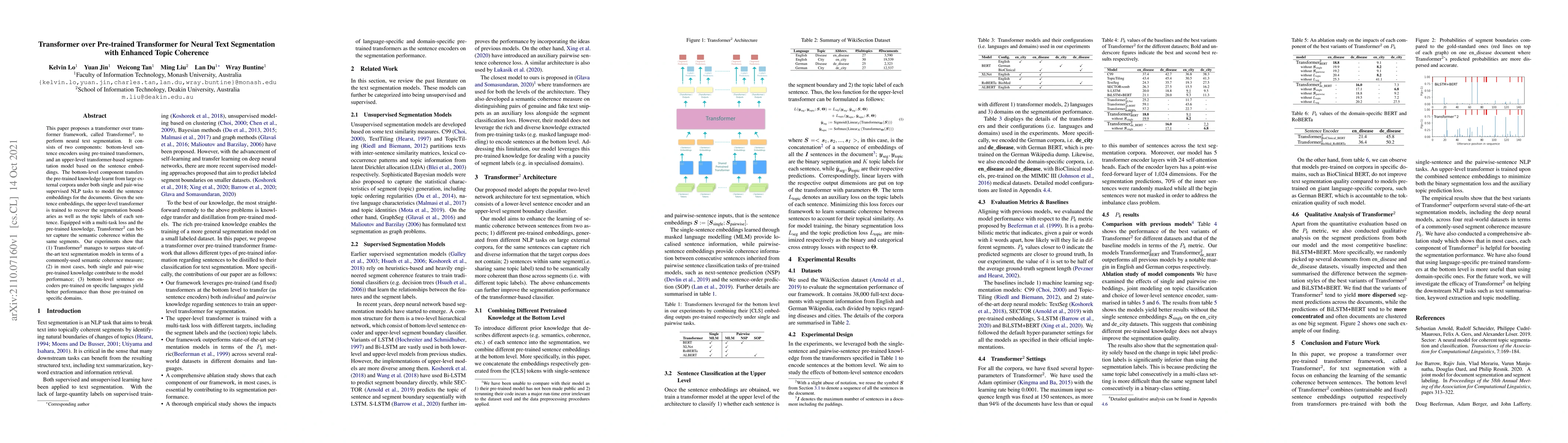 This paper introduces Transformer$^2$, a two-level transformer framework for neural text segmentation that leverages pre-trained transformers for sentence encoding and an upper-level transformer for segmentation. The model achieves superior semantic coherence and outperforms state-of-the-art methods, demonstrating the benefits of both single and pair-wise pre-trained language knowledge.