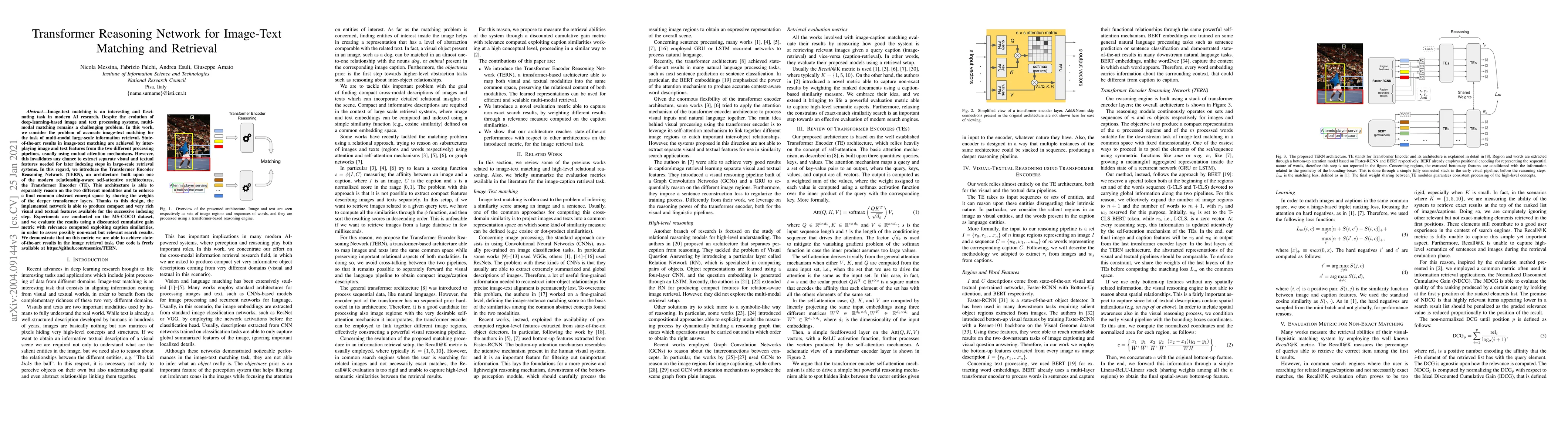 The paper introduces the Transformer Encoder Reasoning Network (TERN) for accurate image-text matching in large-scale information retrieval, achieving state-of-the-art results on the MS-COCO dataset. TERN separately reasons on visual and textual features while enforcing a shared abstract concept space, enabling effective indexing for retrieval.