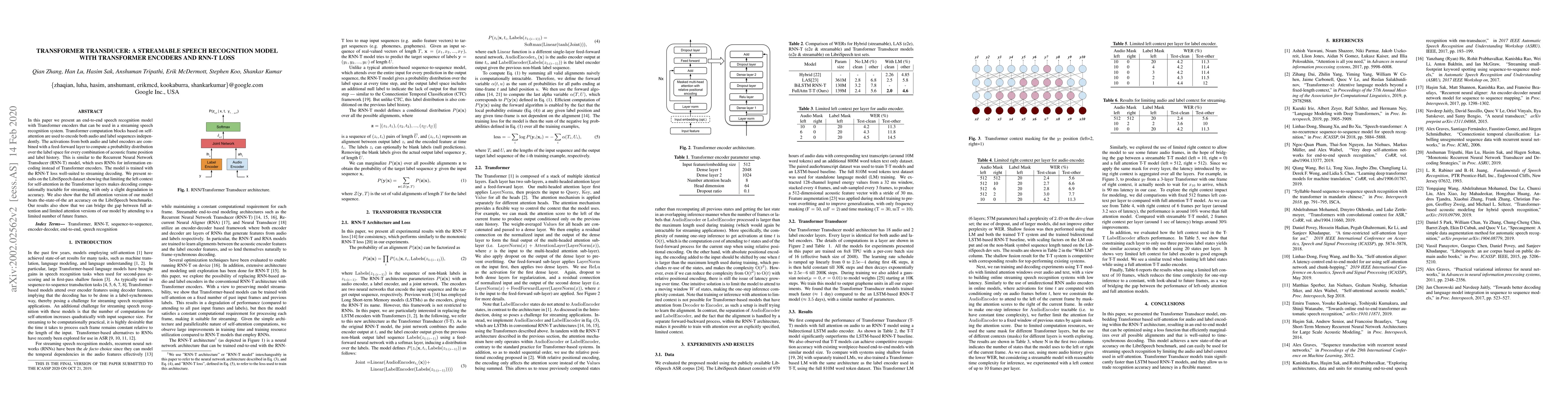 This paper introduces a streamable end-to-end speech recognition model using Transformer encoders and RNN-T loss, achieving state-of-the-art accuracy on LibriSpeech while maintaining computational efficiency for streaming applications. Limited self-attention in Transformer layers balances accuracy and tractability.