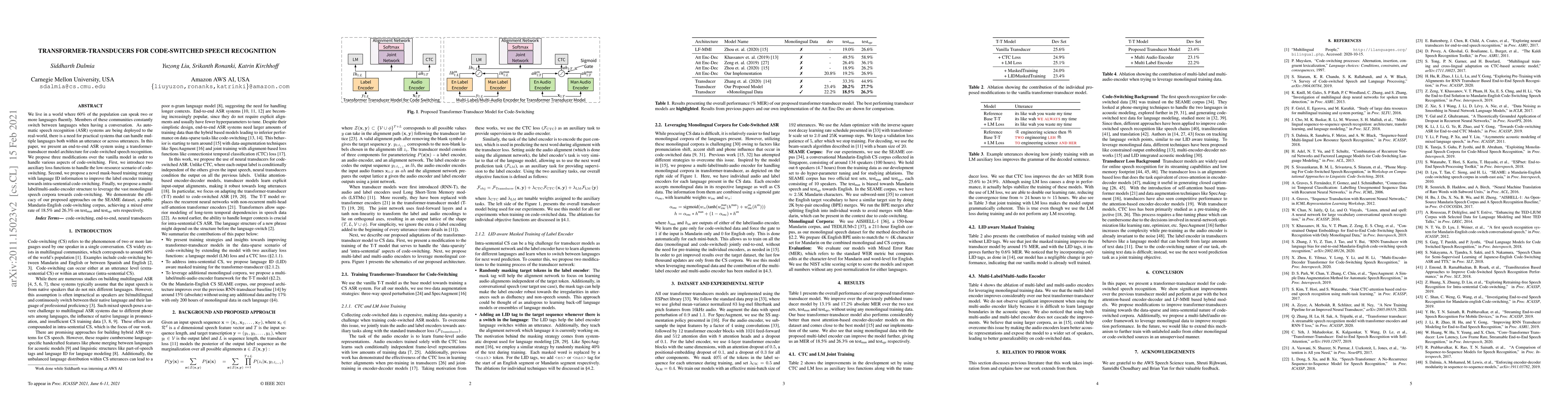This paper proposes an end-to-end transformer-transducer model for code-switched speech recognition, introducing modifications to handle low-resource scenarios and intra-sentential code-switching. The approach achieves mixed error rates of 18.5% and 26.3% on Mandarin-English code-switching data.