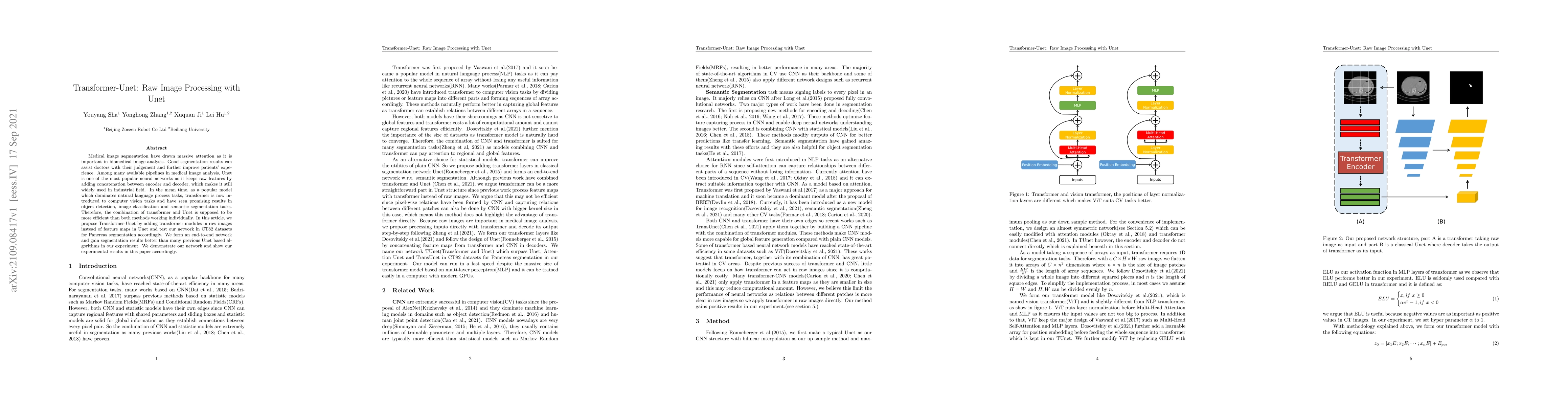 Medical image segmentation have drawn massive attention as it is important in biomedical image analysis. Good segmentation results can assist doctors with their judgement and further improve patients' experience. Among many available pipelines in medical image analysis, Unet is one of the most popular neural networks as it keeps raw features by adding concatenation between encoder and decoder, which makes it still widely used in industrial field. In the mean time, as a popular model which dominates natural language process tasks, transformer is now introduced to computer vision tasks and have seen promising results in object detection, image classification and semantic segmentation tasks. Therefore, the combination of transformer and Unet is supposed to be more efficient than both methods working individually. In this article, we propose Transformer-Unet by adding transformer modules in raw images instead of feature maps in Unet and test our network in CT82 datasets for Pancreas segmentation accordingly. We form an end-to-end network and gain segmentation results better than many previous Unet based algorithms in our experiment. We demonstrate our network and show our experimental results in this paper accordingly.