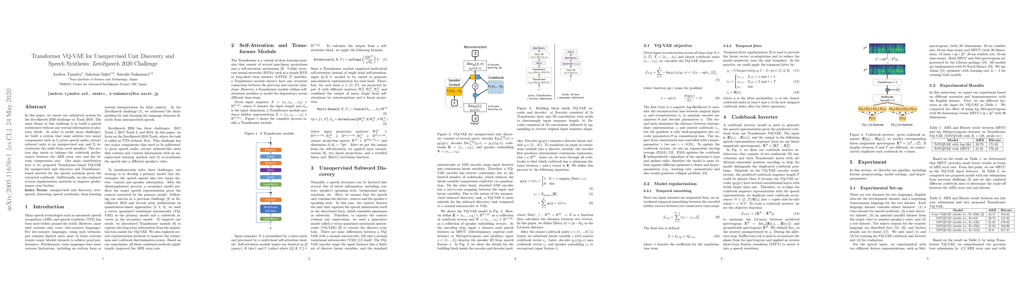In this paper, we report our submitted system for the ZeroSpeech 2020 challenge on Track 2019. The main theme in this challenge is to build a speech synthesizer without any textual information or phonetic labels. In order to tackle those challenges, we build a system that must address two major components such as 1) given speech audio, extract subword units in an unsupervised way and 2) re-synthesize the audio from novel speakers. The system also needs to balance the codebook performance between the ABX error rate and the bitrate compression rate. Our main contribution here is we proposed Transformer-based VQ-VAE for unsupervised unit discovery and Transformer-based inverter for the speech synthesis given the extracted codebook. Additionally, we also explored several regularization methods to improve performance even further.