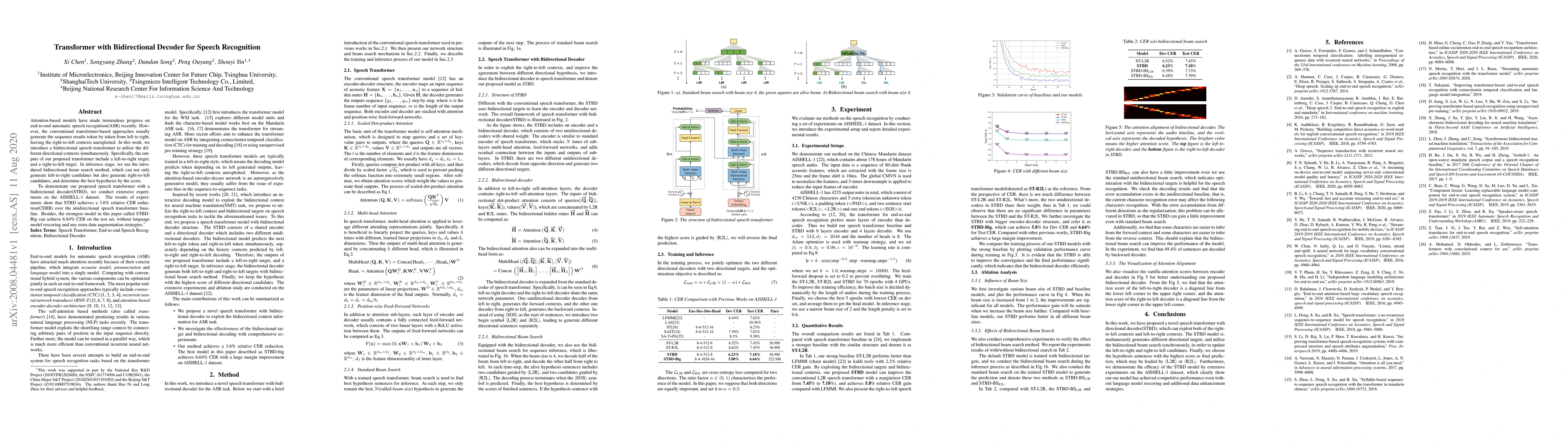 This paper proposes a bidirectional speech transformer with a bidirectional decoder (STBD) to enhance end-to-end automatic speech recognition by utilizing both left-to-right and right-to-left contextual information. Experiments on the AISHELL-1 dataset show a 3.6% relative CER reduction compared to a unidirectional transformer baseline.