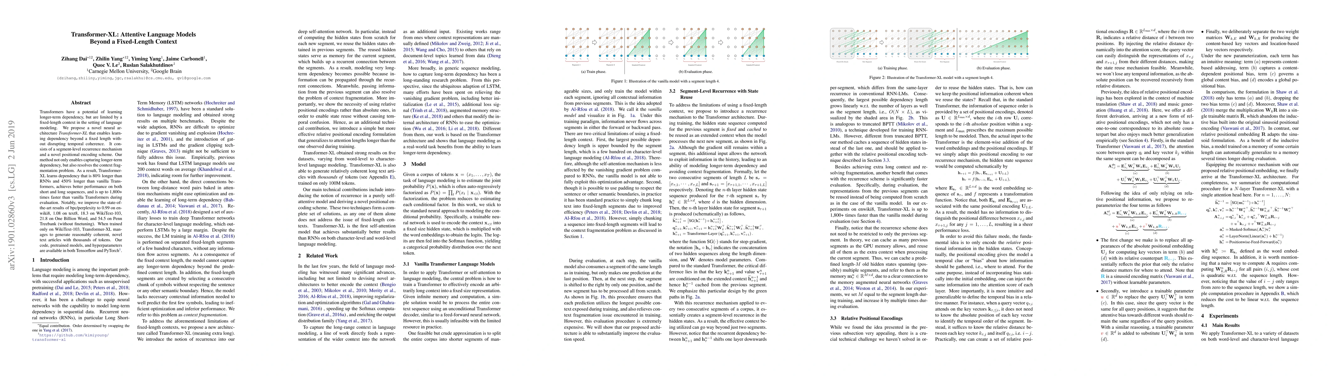 Transformers have a potential of learning longer-term dependency, but are limited by a fixed-length context in the setting of language modeling. We propose a novel neural architecture Transformer-XL that enables learning dependency beyond a fixed length without disrupting temporal coherence. It consists of a segment-level recurrence mechanism and a novel positional encoding scheme. Our method not only enables capturing longer-term dependency, but also resolves the context fragmentation problem. As a result, Transformer-XL learns dependency that is 80% longer than RNNs and 450% longer than vanilla Transformers, achieves better performance on both short and long sequences, and is up to 1,800+ times faster than vanilla Transformers during evaluation. Notably, we improve the state-of-the-art results of bpc/perplexity to 0.99 on enwiki8, 1.08 on text8, 18.3 on WikiText-103, 21.8 on One Billion Word, and 54.5 on Penn Treebank (without finetuning). When trained only on WikiText-103, Transformer-XL manages to generate reasonably coherent, novel text articles with thousands of tokens. Our code, pretrained models, and hyperparameters are available in both Tensorflow and PyTorch.