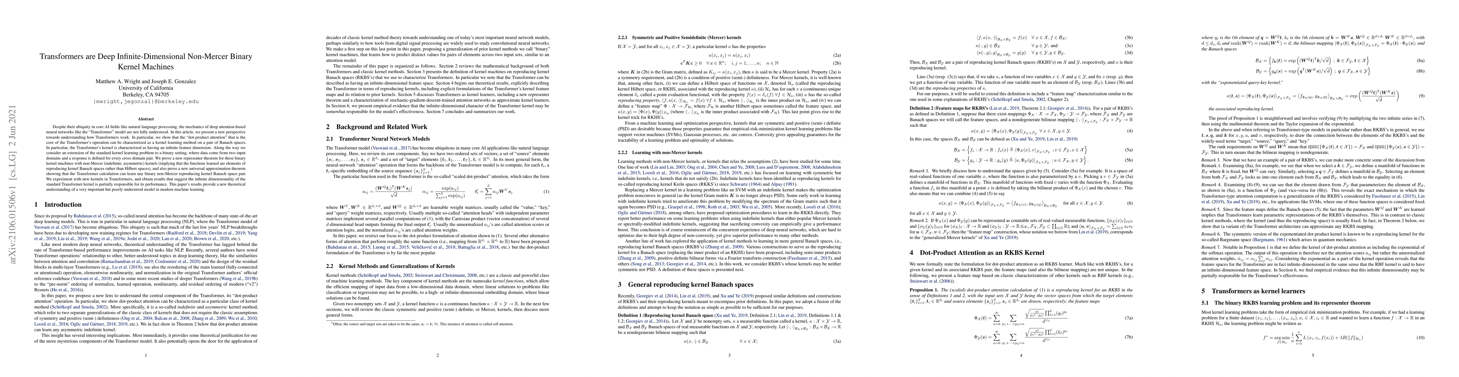 This paper provides a novel theoretical framework for understanding the mechanics of Transformers, showing that their "dot-product attention" can be viewed as an infinite-dimensional kernel learning method on Banach spaces. It introduces a new representer theorem for binary kernel machines with non-Mercer kernels and demonstrates the universal approximation capabilities of Transformers.